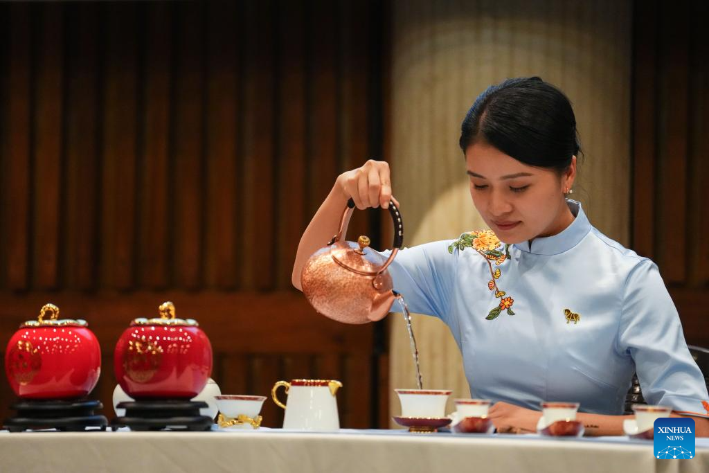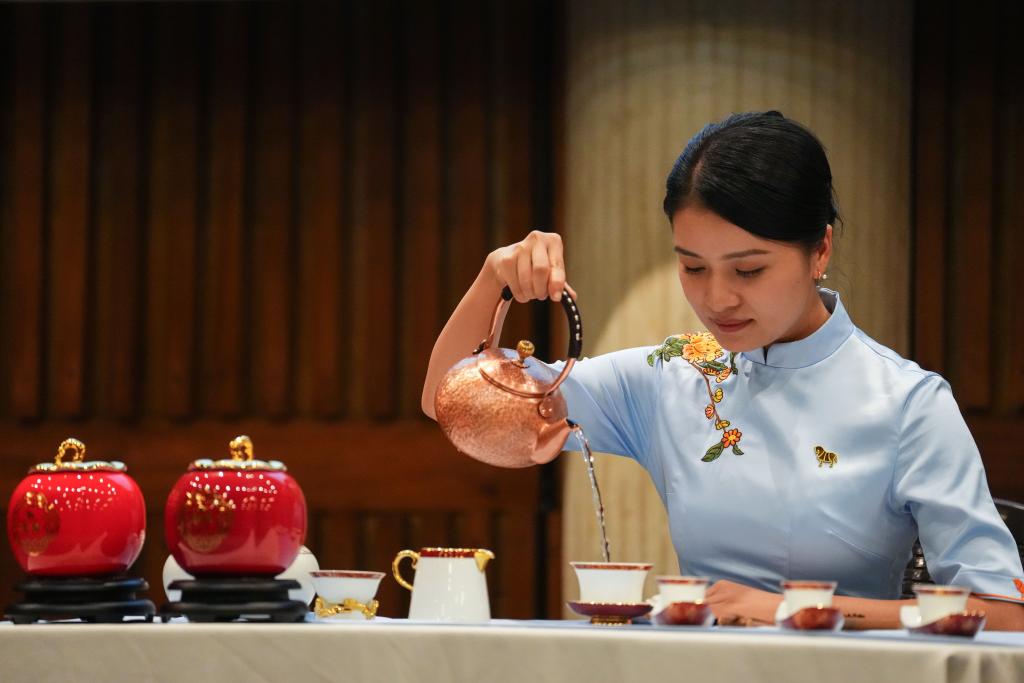 Imagen del 25 de septiembre de 2025 de una mujer realizando una demostración de preparación de té durante el evento "El té une al mundo", llevado a cabo en el Centro Cultural Gabriel García Márquez, en Bogotá, capital de Colombia. Entre aromas y sabores que recorren continentes, el Centro Cultural Gabriel García Márquez de Bogotá fue escenario el jueves del evento "El té une al mundo", un encuentro que fusionó la milenaria tradición del té chino con la rica cultura del café colombiano, en un diálogo cultural que busca acercar corazones y mercados entre China y Colombia. (Xinhua/Andrés Moreno)