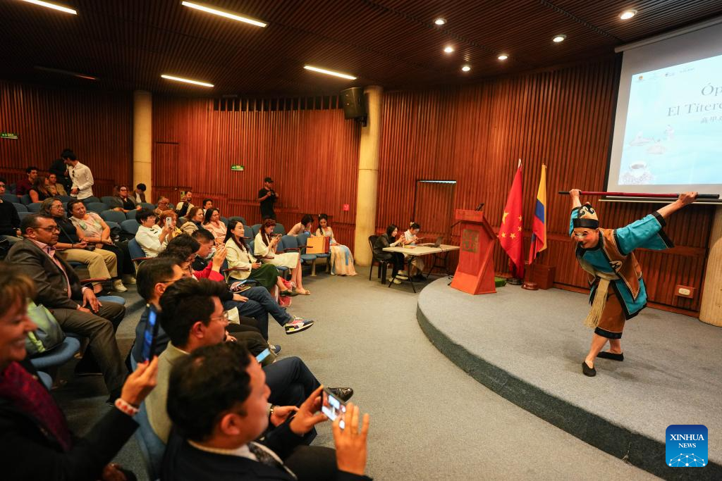 Imagen del 25 de septiembre de 2025 de un artista manejando una marioneta durante el evento "El té une al mundo", llevado a cabo en el Centro Cultural Gabriel García Márquez, en Bogotá, capital de Colombia. Entre aromas y sabores que recorren continentes, el Centro Cultural Gabriel García Márquez de Bogotá fue escenario el jueves del evento "El té une al mundo", un encuentro que fusionó la milenaria tradición del té chino con la rica cultura del café colombiano, en un diálogo cultural que busca acercar corazones y mercados entre China y Colombia. (Xinhua/Andrés Moreno)