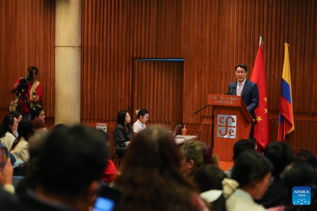 Imagen del 25 de septiembre de 2025 del embajador de China en Colombia, Zhu Jingyang, hablando durante el evento "El té une al mundo", llevado a cabo en el Centro Cultural Gabriel García Márquez, en Bogotá, capital de Colombia. Entre aromas y sabores que recorren continentes, el Centro Cultural Gabriel García Márquez de Bogotá fue escenario el jueves del evento "El té une al mundo", un encuentro que fusionó la milenaria tradición del té chino con la rica cultura del café colombiano, en un diálogo cultural que busca acercar corazones y mercados entre China y Colombia. (Xinhua/Andrés Moreno)