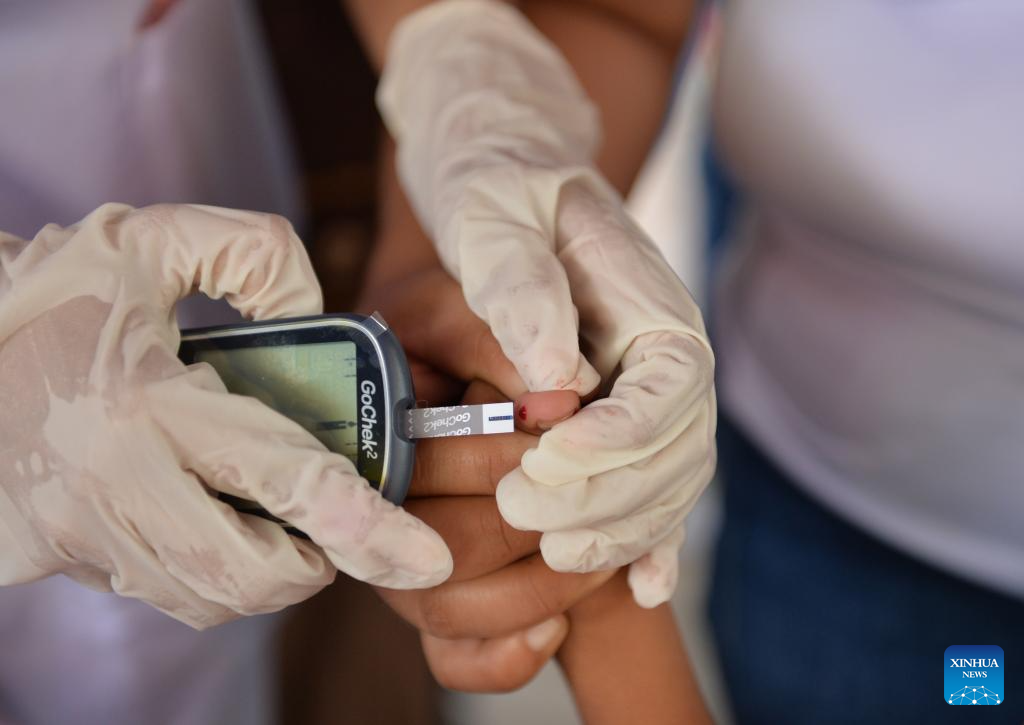 Imagen del 1 de octubre de 2025 de un trabajador de la salud realizando un chequeo médico durante el inicio de la Campaña Nacional "Sin Diabetes", en Masaya, Nicaragua. El Ministerio de Salud de Nicaragua inició el miércoles la Campaña Nacional "Sin Diabetes" cuya meta es examinar 2.5 millones de niños, adolescentes y jóvenes de hasta los 20 años. (Xinhua/Noelia Aráuz)