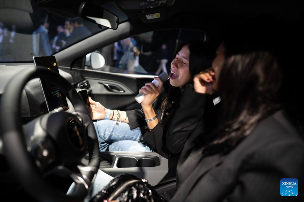 Dos mujeres cantan utilizando el "modo karaoke" del modelo Dolphin Mini de la compañía china de tecnología Build Your Dreams (BYD) durante el evento de lanzamiento de modelos para el mercado argentino, en la ciudad de Buenos Aires, capital de Argentina, el 8 de octubre de 2025. Los autos eléctricos e híbridos del fabricante chino BYD desembarcaron oficialmente en Argentina tras un lanzamiento realizado el miércoles en la ciudad de Buenos Aires. (Xinhua/Martín Zabala)