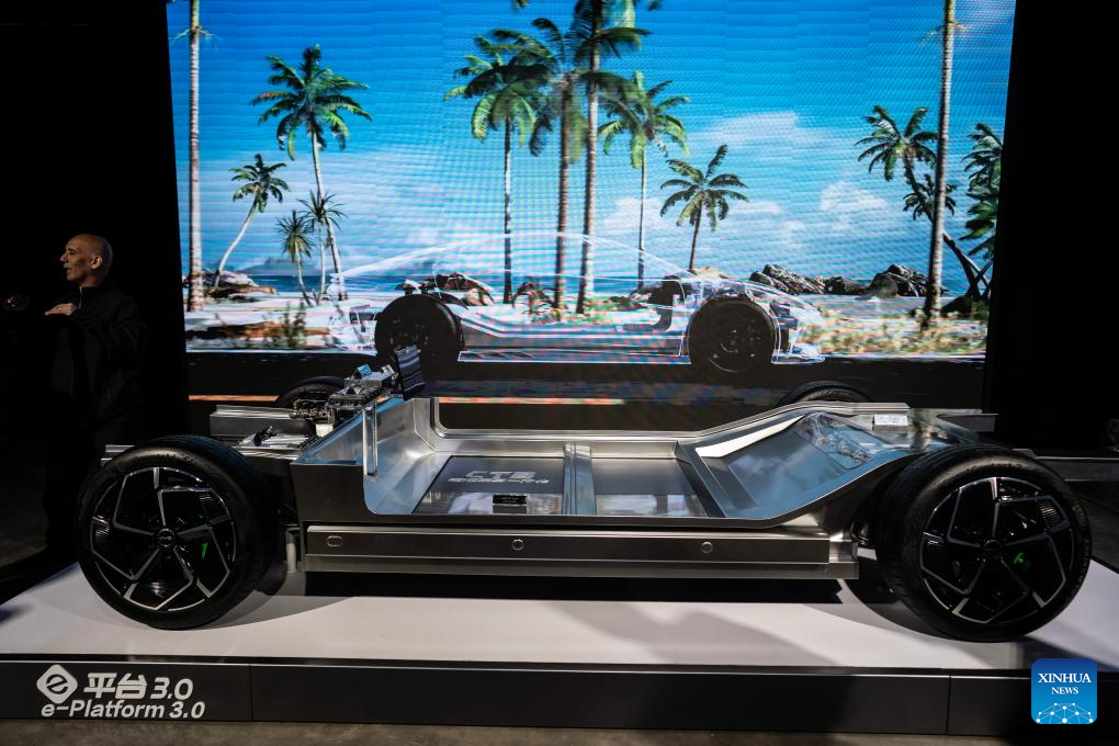 La "e-platform 3.0" para autos eléctricos de la compañía china de tecnología Build Your Dreams (BYD) es exhibida durante el evento de lanzamiento de modelos para el mercado argentino, en la ciudad de Buenos Aires, capital de Argentina, el 8 de octubre de 2025. Los autos eléctricos e híbridos del fabricante chino BYD desembarcaron oficialmente en Argentina tras un lanzamiento realizado el miércoles en la ciudad de Buenos Aires. (Xinhua/Martín Zabala)