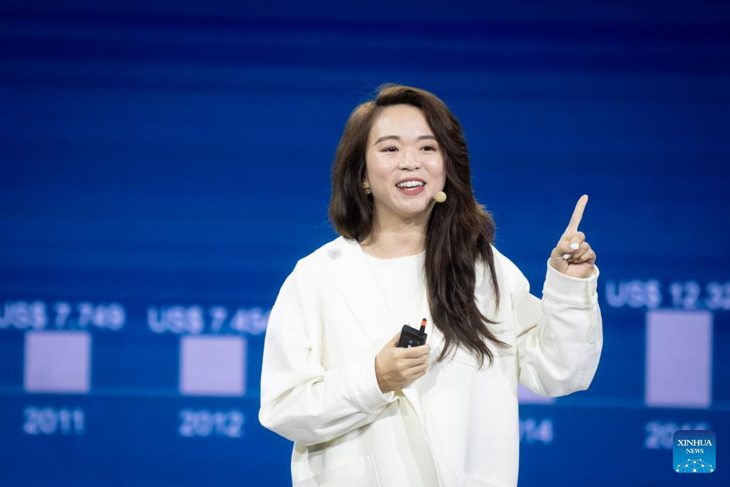 La vicepresidenta de Operaciones de Build Your Dreams (BYD) América, Li Nan, habla durante el evento de lanzamiento de modelos para el mercado argentino, en la ciudad de Buenos Aires, capital de Argentina, el 8 de octubre de 2025. Los autos eléctricos e híbridos del fabricante chino BYD desembarcaron oficialmente en Argentina tras un lanzamiento realizado el miércoles en la ciudad de Buenos Aires. (Xinhua/Martín Zabala)