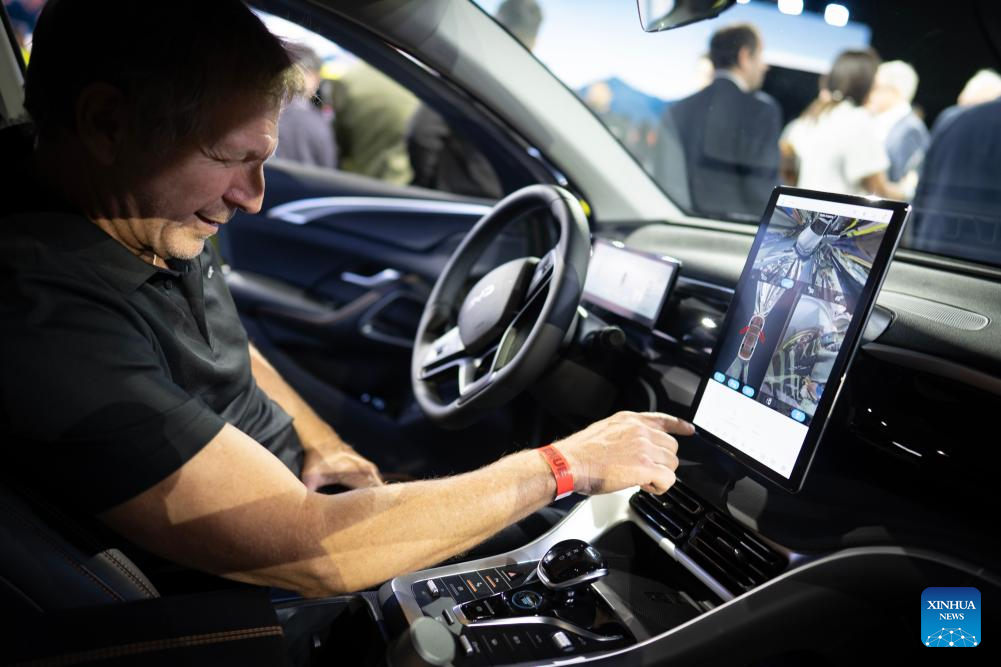 Un hombre interactúa con la pantalla multimedia del modelo Song Pro DM-i de la compañía china de tecnología Build Your Dreams (BYD) durante el evento de lanzamiento de modelos para el mercado argentino, en la ciudad de Buenos Aires, capital de Argentina, el 8 de octubre de 2025. Los autos eléctricos e híbridos del fabricante chino BYD desembarcaron oficialmente en Argentina tras un lanzamiento realizado el miércoles en la ciudad de Buenos Aires. (Xinhua/Martín Zabala)