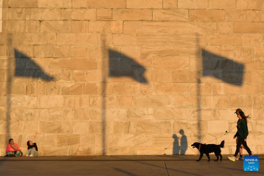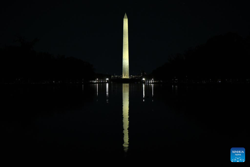 Imagen del 8 de octubre de 2025 de un hombre caminando junto al reflejo del Monumento a Washington, en Washington, D.C., Estados Unidos. El Senado de Estados Unidos no logró aprobar el miércoles por sexta vez los proyectos de ley de financiación, lo que prolonga el estancamiento del cierre del Gobierno federal. (Xinhua/Li Rui)