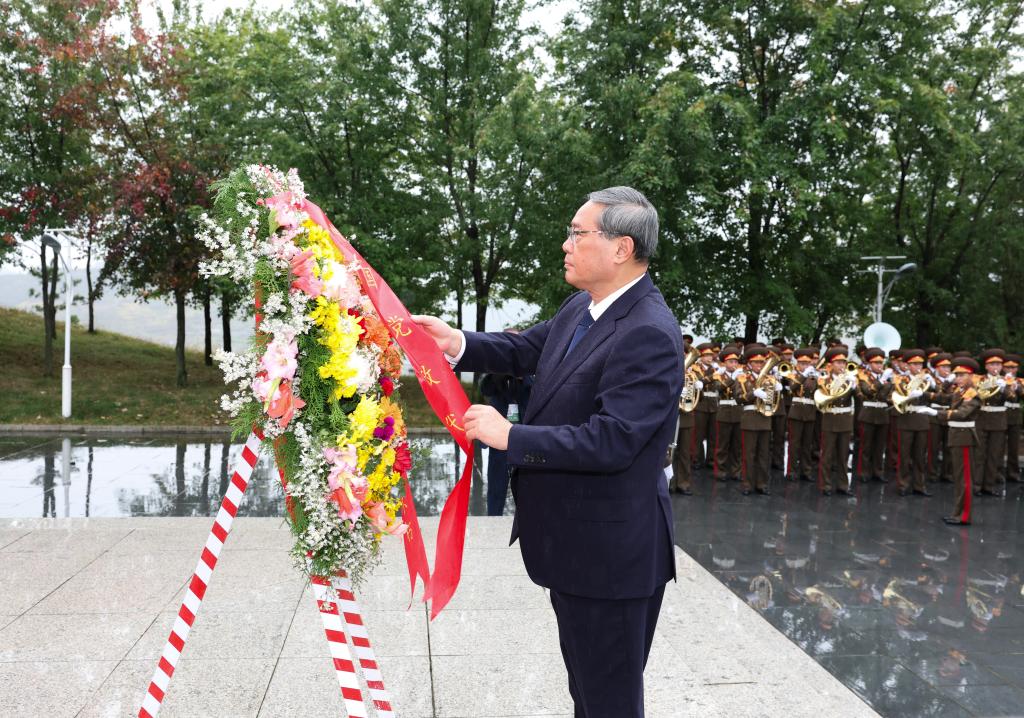 PYONGYANG, 10 oct (Xinhua) -- El primer ministro chino, Li Qiang, rindió homenaje hoy viernes a los mártires de los Voluntarios del Pueblo Chino (VPC) en un cementerio de Anju.