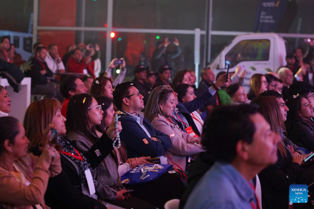 Imagen del 9 de octubre de 2025 de personas asistiendo al evento de inauguración de una nueva agencia comercial de DFAC Dongfeng, en Bogotá, capital de Colombia. La marca china de vehículos de transporte de carga y pasajeros DFAC Dongfeng amplió su presencia en Colombia con la inauguración, la noche del jueves, de una nueva agencia comercial ubicada en el occidente de Bogotá. (Xinhua/Andrés Moreno)