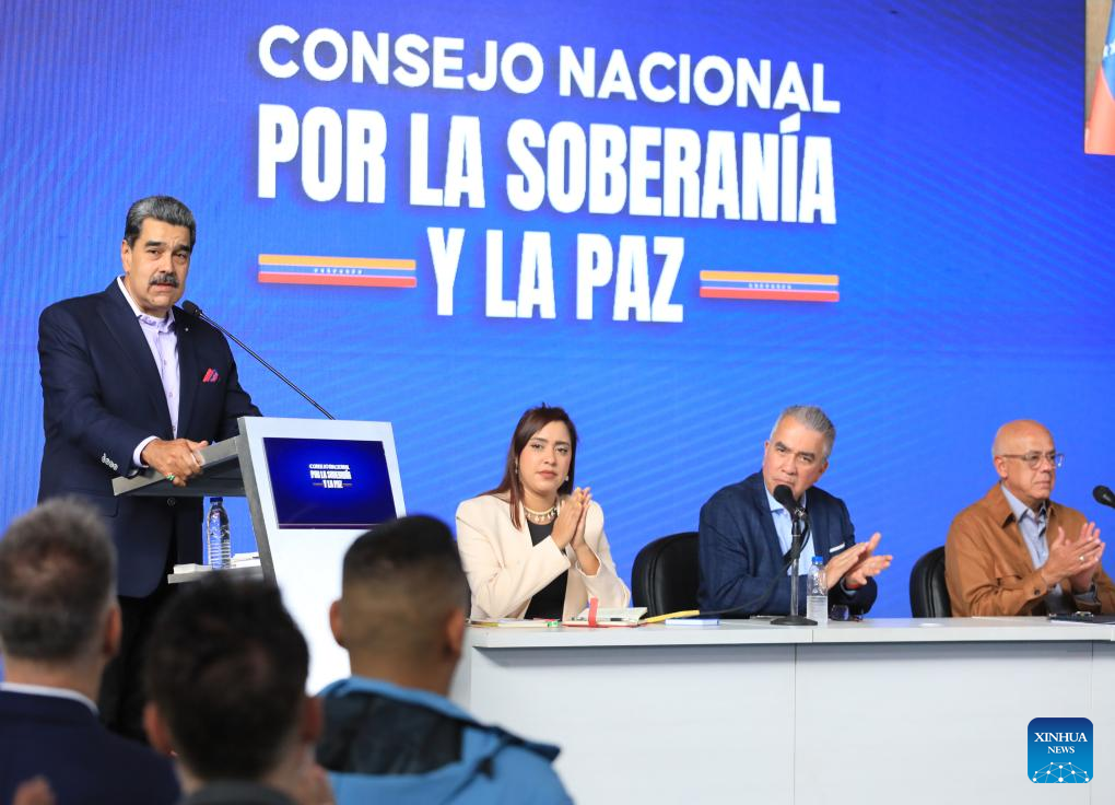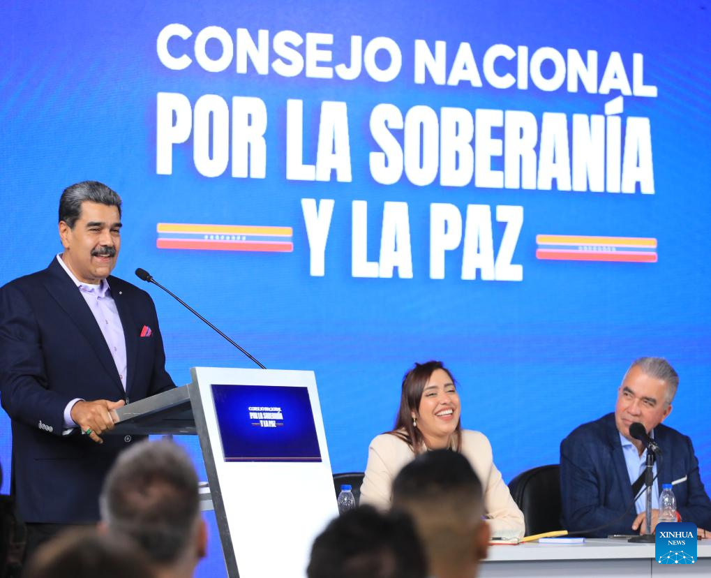 Imagen proveída por la Presidencia de Venezuela del presidente venezolano Nicolás Maduro (i), participando durante una reunión del Consejo Nacional por la Soberanía y la Paz, en Caracas, Venezuela, el 15 de octubre de 2025. Maduro calificó el miércoles como un "éxito absoluto" la activación y el cumplimiento de las tareas en las Zonas Operativas de Defensa Integral, para el fortalecimiento de la soberanía nacional. (Xinhua/Presidencia de Venezuela)
