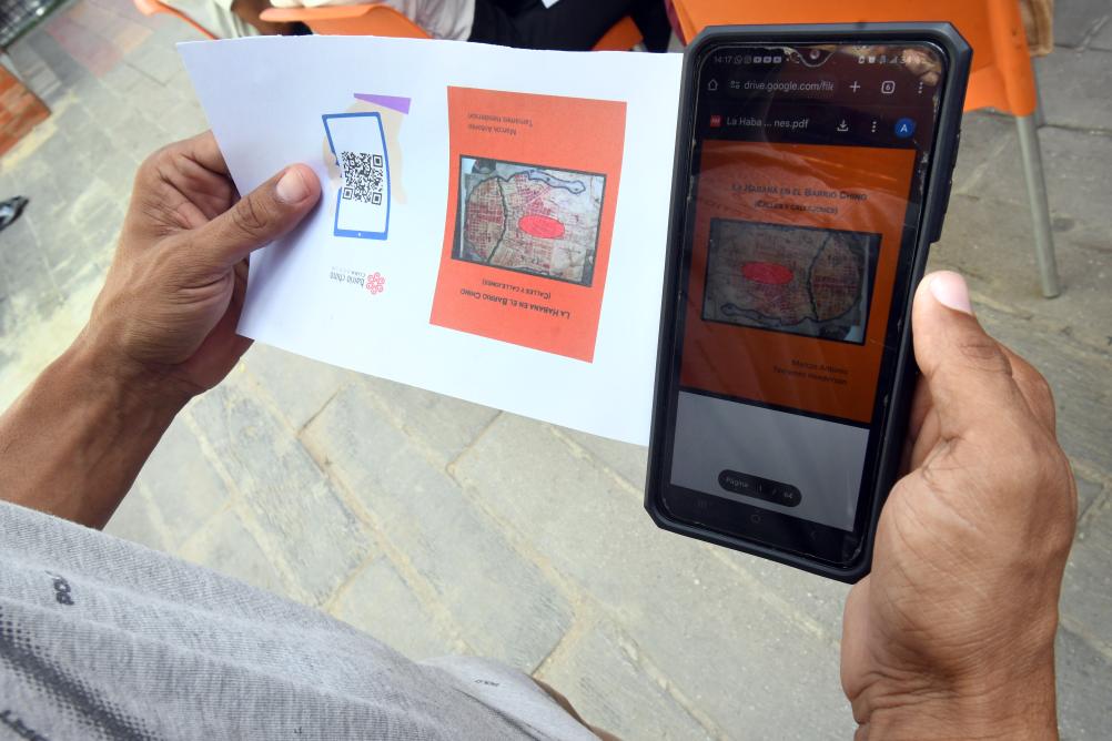 Imagen del 16 de octubre de 2025 de una persona mostrando la carátula del libro digital "La Habana en el Barrio Chino (Calles y callejones)", del investigador cubano, Marcos Antonio Tamames Henderson, durante su presentación, en La Habana, capital de Cuba. El libro digital "La Habana en el Barrio Chino (Calles y callejones)", del investigador cubano, Marcos Antonio Tamames Henderson, fue presentado el jueves en la Cuchilla del Barrio Chino, como parte de las celebraciones por el 65 aniversario del establecimiento de relaciones diplomáticas entre China y Cuba. (Xinhua/Joaquín Hernández)
