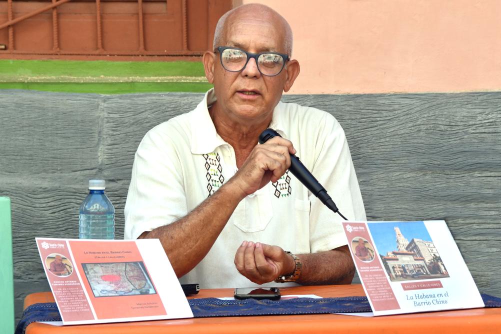 Imagen del 16 de octubre de 2025 del investigador cubano, Marcos Antonio Tamames Henderson, pronunciando un discurso durante la presentación de su libro digital "La Habana en el Barrio Chino (Calles y callejones)", en La Habana, capital de Cuba. El libro digital "La Habana en el Barrio Chino (Calles y callejones)", del investigador cubano, Marcos Antonio Tamames Henderson, fue presentado el jueves en la Cuchilla del Barrio Chino, como parte de las celebraciones por el 65 aniversario del establecimiento de relaciones diplomáticas entre China y Cuba. (Xinhua/Joaquín Hernández)