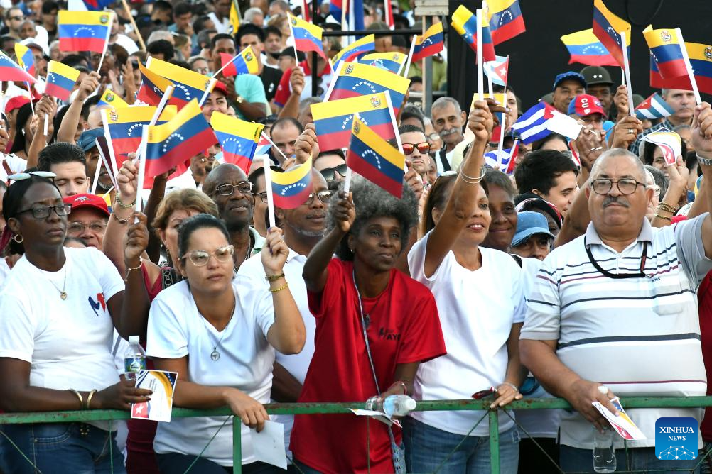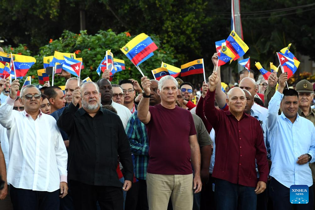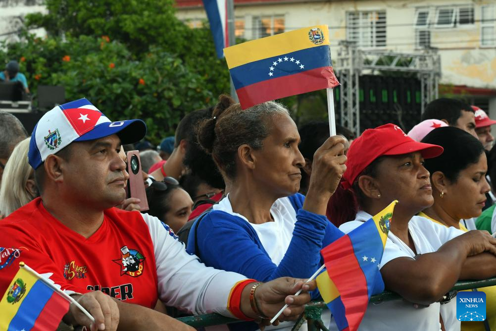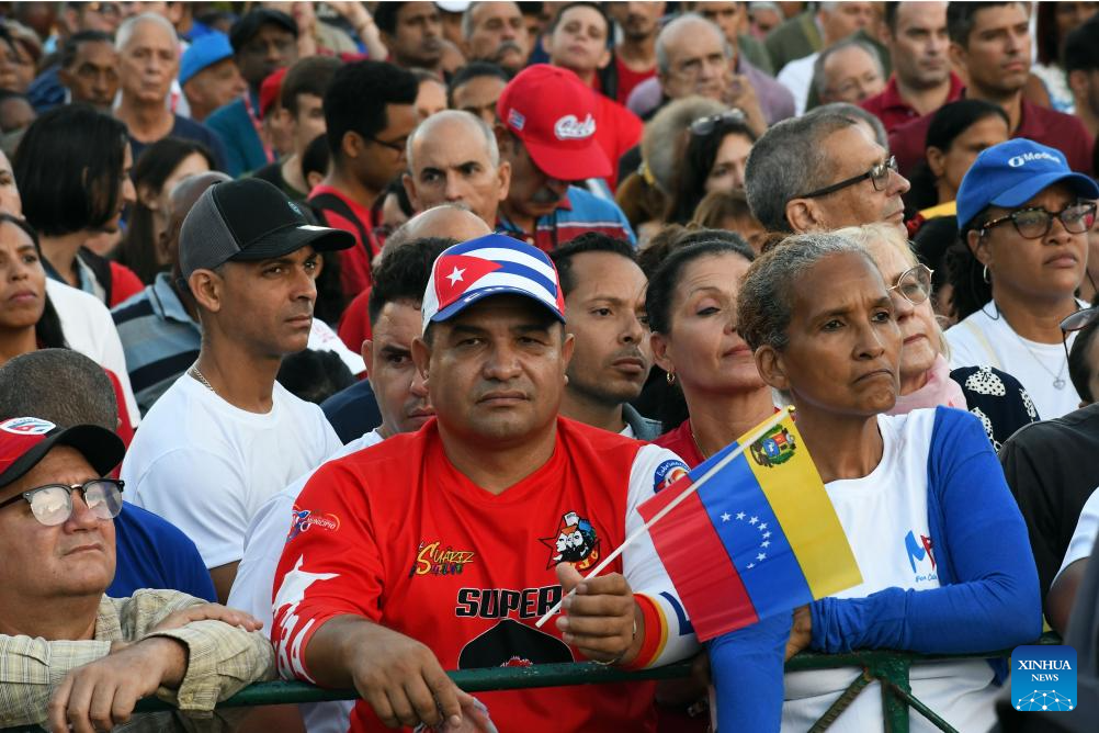 LA HABANA, 17 octubre, 2025 (Xinhua) -- Personas participan en el acto de apoyo a la causa venezolana y de rechazo a la injerencia de Estados Unidos, en La Habana, capital de Cuba, el 17 de octubre de 2025. Miles de cubanos se dieron cita el viernes en la ciudad de La Habana, para ratificar su solidaridad con el pueblo y el Gobierno de Venezuela, ante la escalada injerencista de Estados Unidos contra la nación sudamericana. (Xinhua/Joaquín Hernández)