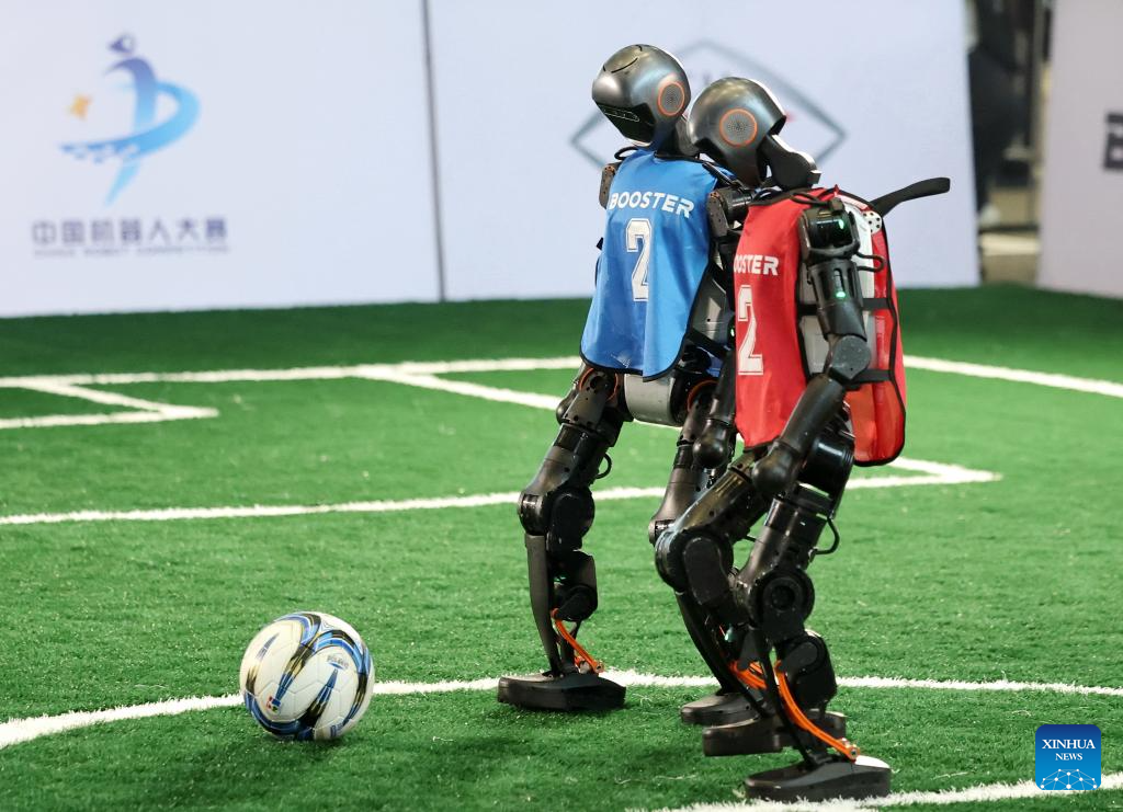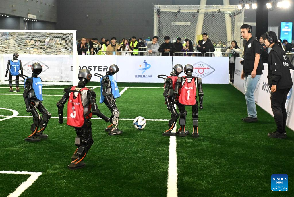 SHIJIAZHUANG, 17 octubre, 2025 (Xinhua) -- Robots son vistos durante un partido de fútbol en el Centro Internacional de Convenciones y Exposiciones, en Shijiazhuang, en la provincia de Hebei, en el norte de China, el 17 de octubre de 2025. La Competencia de Robots de China 2025 y el RoboCup China Open se celebran aquí desde el viernes hasta el domingo. (Xinhua/Chen Qibao)