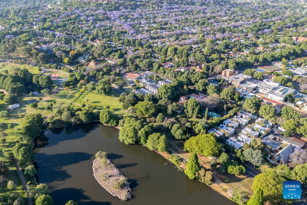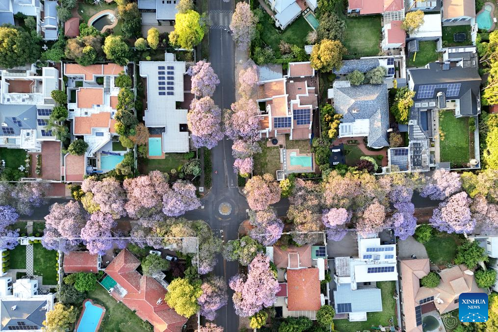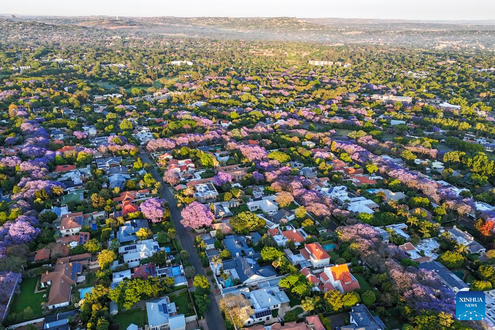 JOHANNESBURGO, 17 octubre, 2025 (Xinhua) -- Vista aérea tomada con un dron el 16 de octubre de 2025 de árboles de jacaranda floreciendo, en Johannesburgo, Sudáfrica. Los árboles de jacaranda florecen aquí desde mediados de octubre hasta principios de noviembre cada año. (Xinhua/Shiraaz Mohamed)
