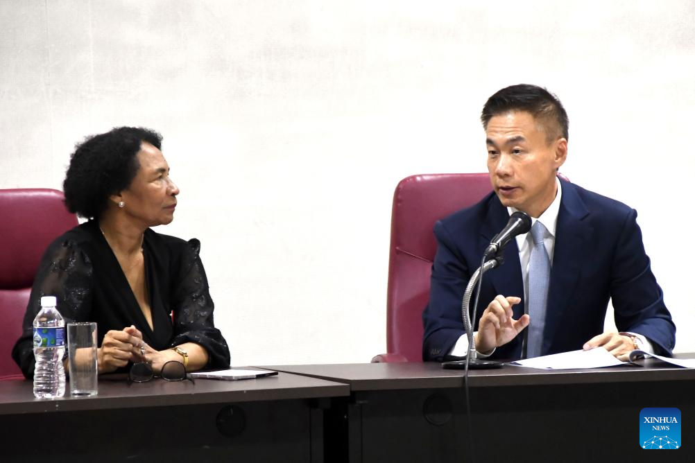 Imagen del 17 de octubre de 2025 del embajador chino en Cuba, Hua Xin (d), realizando una intervención durante una Jornada Conmemorativa China-Cuba, como parte del programa de actividades por el 65º aniversario del establecimiento de relaciones diplomáticas entre ambas naciones, en La Habana, capital de Cuba. Las relaciones entre China y Cuba, sus bases históricas y los vínculos de cooperación en múltiples áreas, fueron analizados el viernes en la Universidad de La Habana. (Xinhua/Joaquín Hernández)
