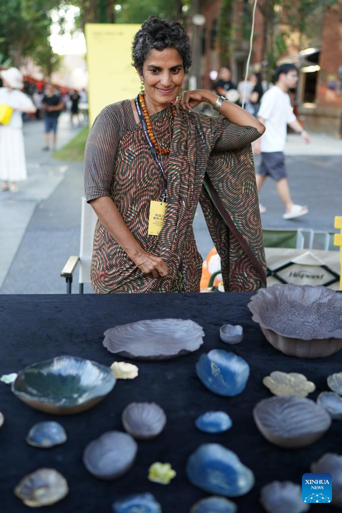 JINGDEZHEN, 18 octubre, 2025 (Xinhua) -- Imagen del 17 de octubre de 2025 de una artista de India mostrando sus obras en un carnaval de cerámica llevado a cabo como un evento paralelo de la Exposición Internacional de Cerámica de Jingdezhen de China 2025, en Jingdezhen, en la provincia de Jiangxi, en el este de China. La Exposición Internacional de Cerámica de Jingdezhen de China 2025 fue inaugurada el 18 de octubre en Jingdezhen, una ciudad del este de China conocida como la "capital de la porcelana", atrayendo a más de 1.000 compradores nacionales y extranjeros. (Xinhua/Zhou Mi)