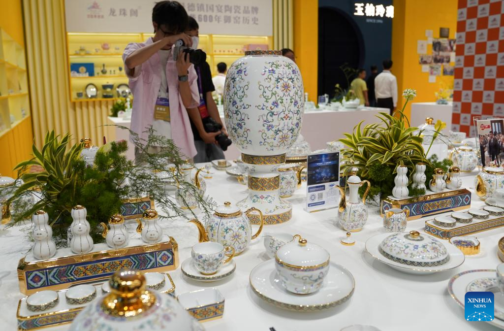JINGDEZHEN, 18 octubre, 2025 (Xinhua) -- Imagen del 18 de octubre de 2025 de vajillas de cerámica exhibidas durante la Exposición Internacional de Cerámica de Jingdezhen de China 2025, en Jingdezhen, en la provincia de Jiangxi, en el este de China. La Exposición Internacional de Cerámica de Jingdezhen de China 2025 fue inaugurada el 18 de octubre en Jingdezhen, una ciudad del este de China conocida como la "capital de la porcelana", atrayendo a más de 1.000 compradores nacionales y extranjeros. (Xinhua/Zhou Mi)