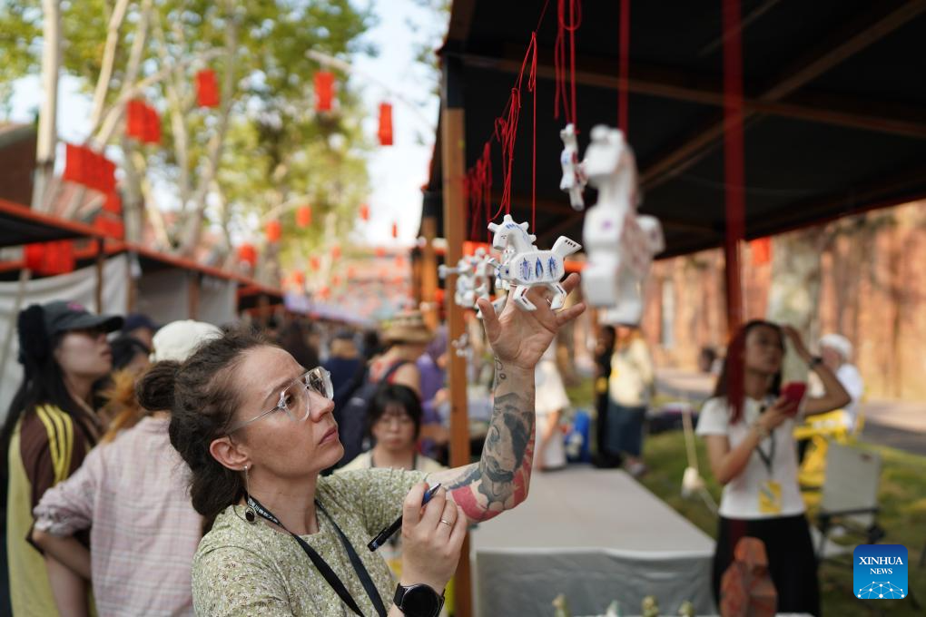 JINGDEZHEN, 18 octubre, 2025 (Xinhua) -- Imagen del 17 de octubre de 2025 de una artista extranjera acomodando sus obras de cerámica en un carnaval de cerámica llevado a cabo como un evento paralelo de la Exposición Internacional de Cerámica de Jingdezhen de China 2025, en Jingdezhen, en la provincia de Jiangxi, en el este de China. La Exposición Internacional de Cerámica de Jingdezhen de China 2025 fue inaugurada el 18 de octubre en Jingdezhen, una ciudad del este de China conocida como la "capital de la porcelana", atrayendo a más de 1.000 compradores nacionales y extranjeros. (Xinhua/Zhou Mi)