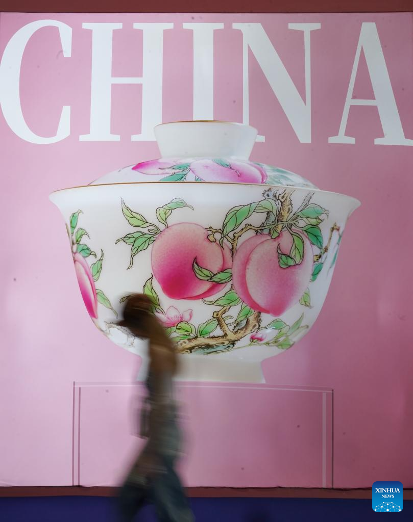 JINGDEZHEN, 18 octubre, 2025 (Xinhua) -- Un visitante camina frente a un cartel que muestra una obra de cerámica durante la Exposición Internacional de Cerámica de Jingdezhen de China 2025, en Jingdezhen, en la provincia de Jiangxi, en el este de China, el 18 de octubre de 2025. La Exposición Internacional de Cerámica de Jingdezhen de China 2025 fue inaugurada el 18 de octubre en Jingdezhen, una ciudad del este de China conocida como la "capital de la porcelana", atrayendo a más de 1.000 compradores nacionales y extranjeros. (Xinhua/Zhou Mi)