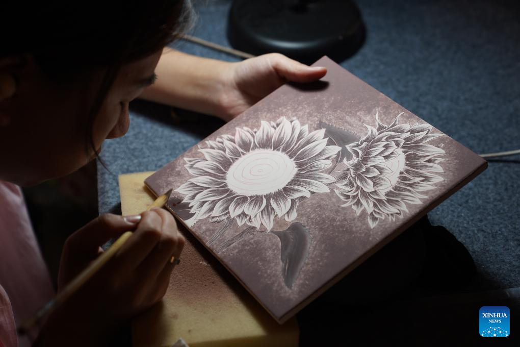 JINGDEZHEN, 18 octubre, 2025 (Xinhua) -- Imagen del 17 de octubre de 2025 de una artista pintando un panel de porcelana azul y blanca en un carnaval de cerámica llevado a cabo como un evento paralelo de la Exposición Internacional de Cerámica de Jingdezhen de China 2025, en Jingdezhen, en la provincia de Jiangxi, en el este de China. La Exposición Internacional de Cerámica de Jingdezhen de China 2025 fue inaugurada el 18 de octubre en Jingdezhen, una ciudad del este de China conocida como la "capital de la porcelana", atrayendo a más de 1.000 compradores nacionales y extranjeros. (Xinhua/Zhou Mi)