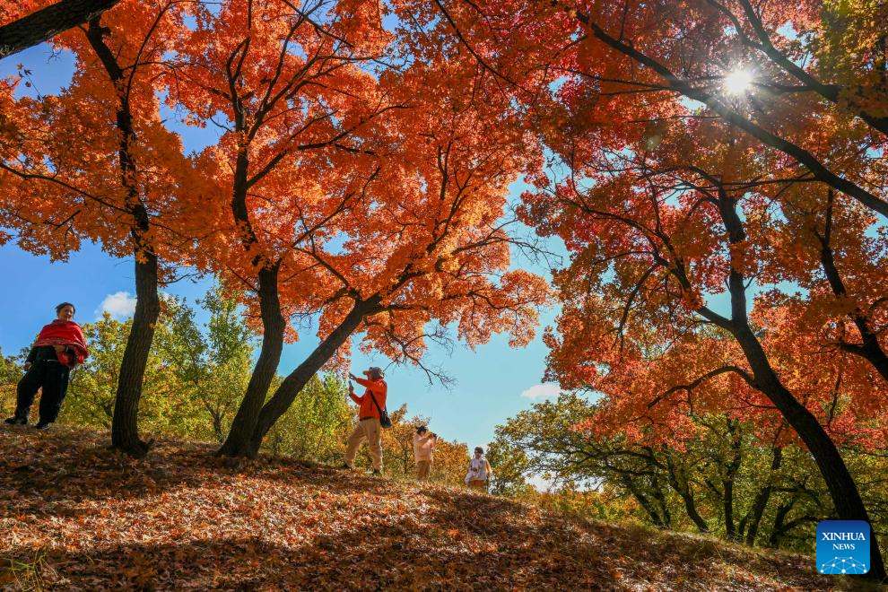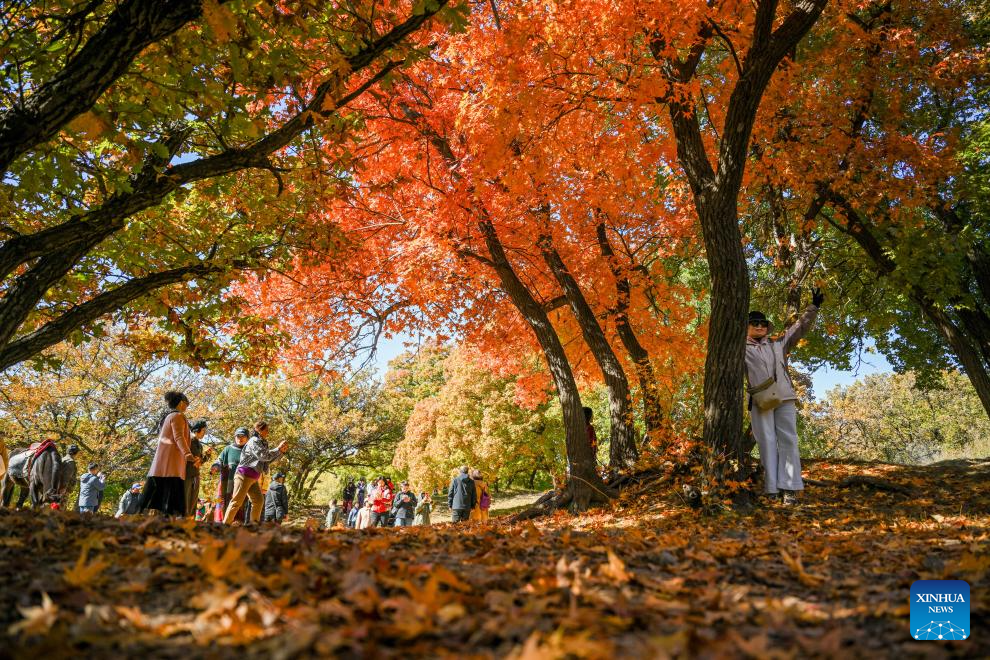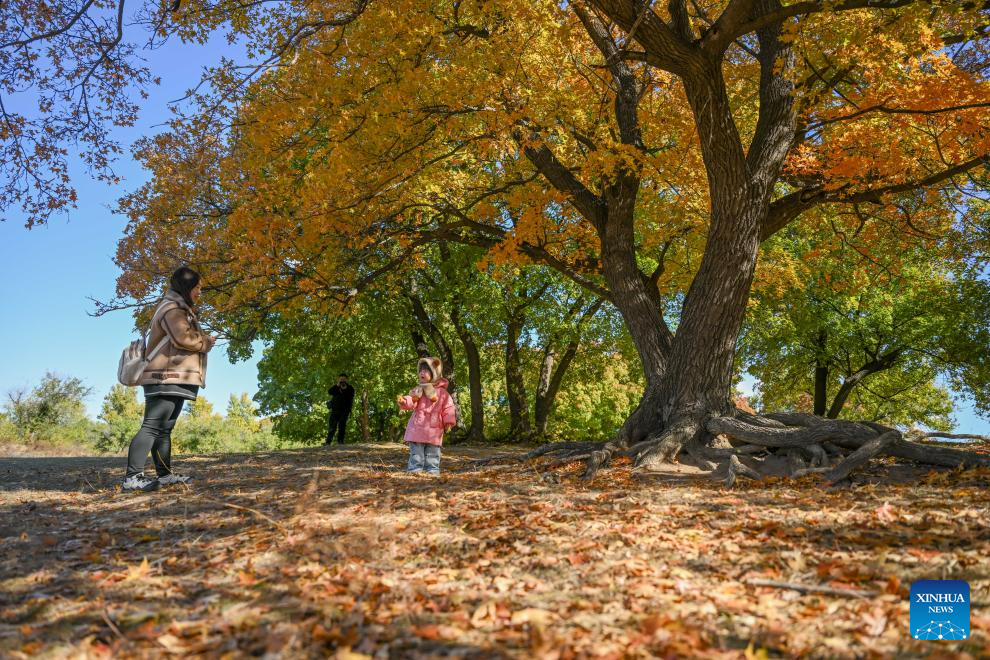 TONGLIAO, 18 octubre, 2025 (Xinhua) -- Turistas visitan un parque forestal, en la bandera trasera del ala izquierda de Horqin de la ciudad de Tongliao, en la región autónoma de Mongolia Interior, en el norte de China, el 18 de octubre de 2025. (Xinhua/Lian Zhen)