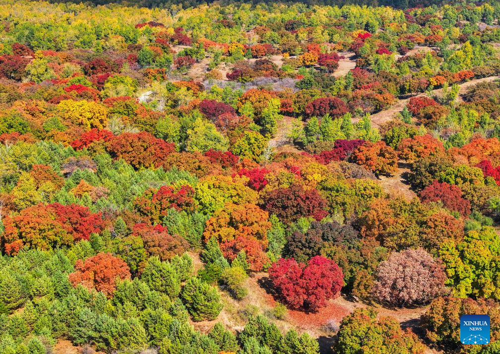 TONGLIAO, 18 octubre, 2025 (Xinhua) -- Vista aérea tomada con un dron el 18 de octubre de 2025 del paisaje otoñal de un parque forestal, en la bandera trasera del ala izquierda de Horqin de la ciudad de Tongliao, en la región autónoma de Mongolia Interior, en el norte de China. (Xinhua/Lian Zhen)