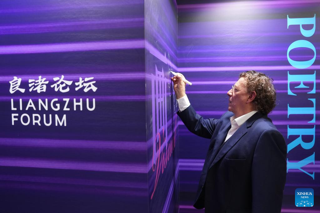 HANGZHOU, 18 octubre, 2025 (Xinhua) -- El poeta español, Juan Carlos Mestre, firma su autógrafo a su llegada al Salón Mundial de Poesía, Danza, Música y Artes Visuales, en Hangzhou, en la provincia de Zhejiang, en el este de China, el 18 de octubre de 2025. El Salón Mundial de Poesía, Danza, Música y Artes Visuales se llevó a cabo aquí el sábado como evento paralelo al tercer Foro de Liangzhu. El salón ofrece presentaciones y diálogos sobre civilizaciones, con la participación de más de 20 artistas y estudiosos de la cultura internacionales. (Xinhua/Huang Zongzhi)