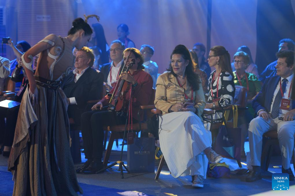 HANGZHOU, 18 octubre, 2025 (Xinhua) -- Invitados observan una presentación organizada por una compañía de canto y baile durante el Salón Mundial de Poesía, Danza, Música y Artes Visuales, en Hangzhou, en la provincia de Zhejiang, en el este de China, el 18 de octubre de 2025. El Salón Mundial de Poesía, Danza, Música y Artes Visuales se llevó a cabo aquí el sábado como evento paralelo al tercer Foro de Liangzhu. El salón ofrece presentaciones y diálogos sobre civilizaciones, con la participación de más de 20 artistas y estudiosos de la cultura internacionales. (Xinhua/Huang Zongzhi)