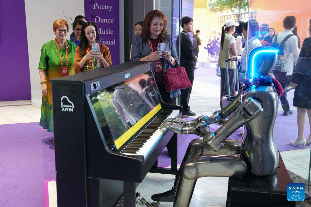 HANGZHOU, 18 octubre, 2025 (Xinhua) -- Invitadas observan un robot tocando el piano durante el Salón Mundial de Poesía, Danza, Música y Artes Visuales, en Hangzhou, en la provincia de Zhejiang, en el este de China, el 18 de octubre de 2025. El Salón Mundial de Poesía, Danza, Música y Artes Visuales se llevó a cabo aquí el sábado como evento paralelo al tercer Foro de Liangzhu. El salón ofrece presentaciones y diálogos sobre civilizaciones, con la participación de más de 20 artistas y estudiosos de la cultura internacionales. (Xinhua/Huang Zongzhi)