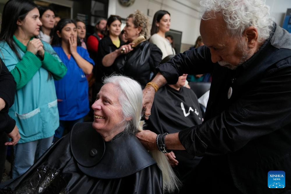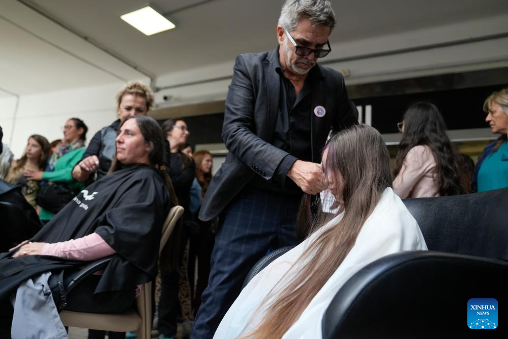 MONTEVIDEO, 20 octubre, 2025 (Xinhua) -- Un peluquero realiza un corte de cabello a una mujer durante una jornada de donación de cabello a beneficio de la confección de accesorios y pelucas para mujeres en tratamiento oncológico en ocasión del Día Mundial de Lucha contra el Cáncer de Mama, en Montevideo, capital de Uruguay, el 20 de octubre de 2025. (Xinhua/Nicolás Celaya)