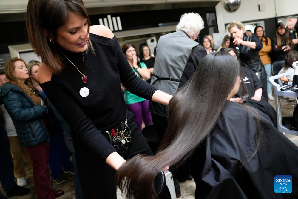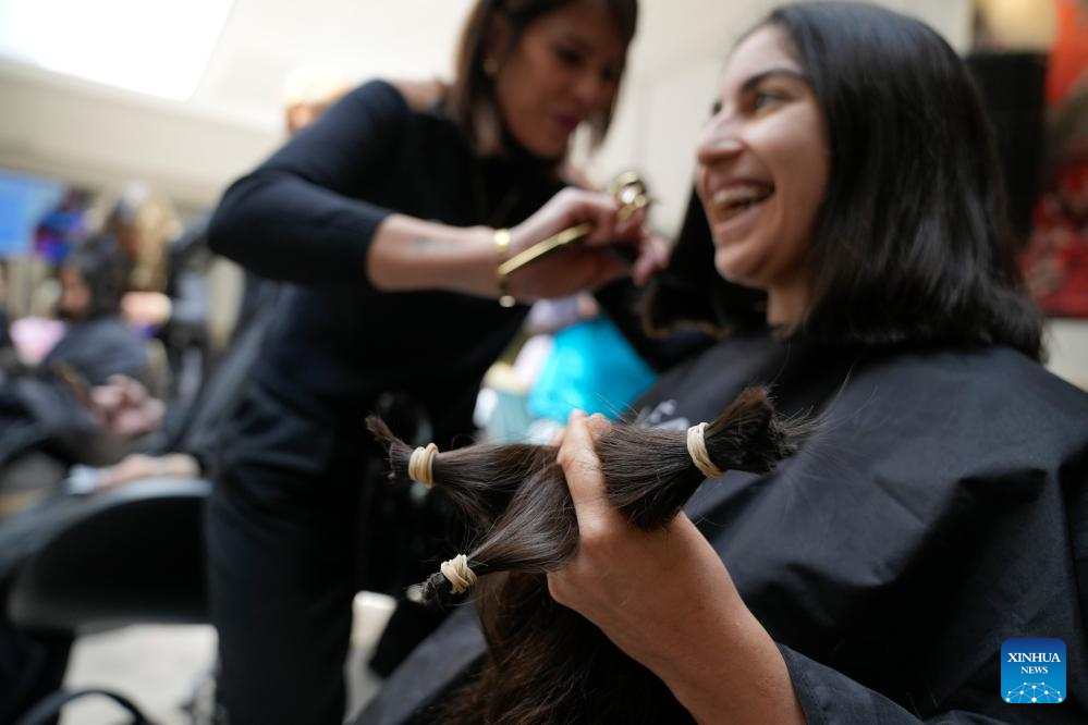 MONTEVIDEO, 20 octubre, 2025 (Xinhua) -- Una peluquera muestra el cabello de una mujer previo a cortarlo durante una jornada de donación de cabello a beneficio de la confección de accesorios y pelucas para mujeres en tratamiento oncológico en ocasión del Día Mundial de Lucha contra el Cáncer de Mama, en Montevideo, capital de Uruguay, el 20 de octubre de 2025. (Xinhua/Nicolás Celaya)
