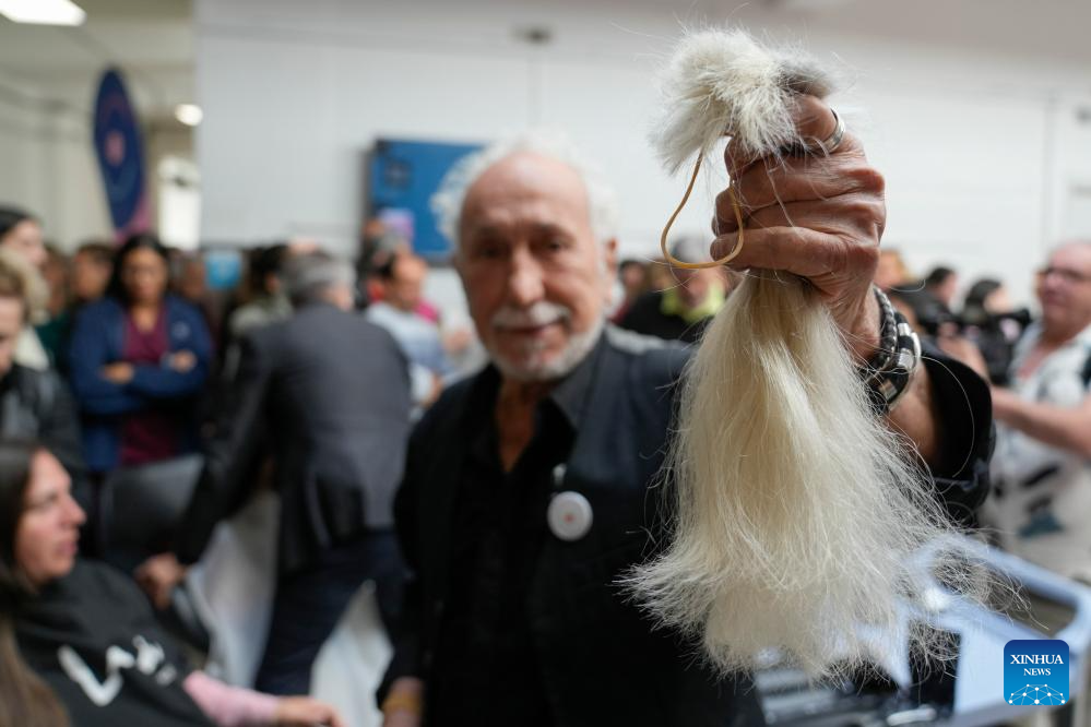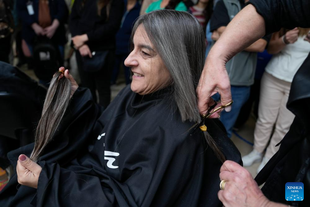 MONTEVIDEO, 20 octubre, 2025 (Xinhua) -- Un peluquero muestra el cabello de una mujer después de cortarlo durante una jornada de donación de cabello a beneficio de la confección de accesorios y pelucas para mujeres en tratamiento oncológico en ocasión del Día Mundial de Lucha contra el Cáncer de Mama, en Montevideo, capital de Uruguay, el 20 de octubre de 2025. (Xinhua/Nicolás Celaya)