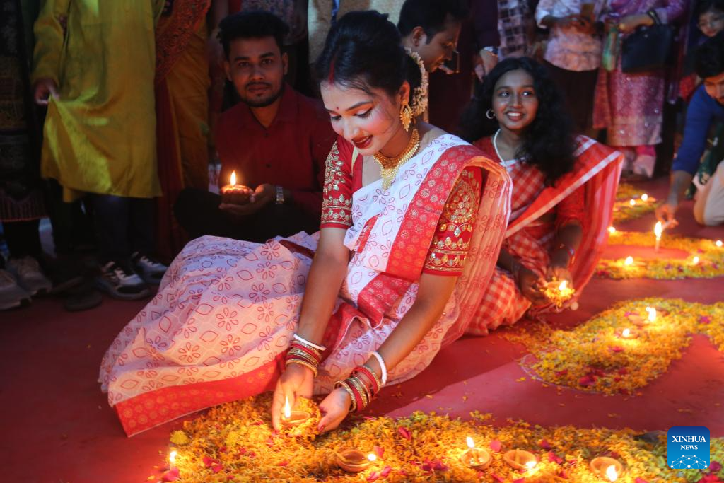 DHAKA, 21 octubre, 2025 (Xinhua) -- Imagen del 20 de octubre de 2025 de personas encendiendo lámparas de aceite para celebrar el Diwali, o el festival hindú de las luces, en un templo, en Dhaka, Bangladesh. (Xinhua/Habibur Rahman)