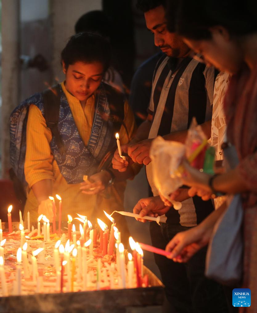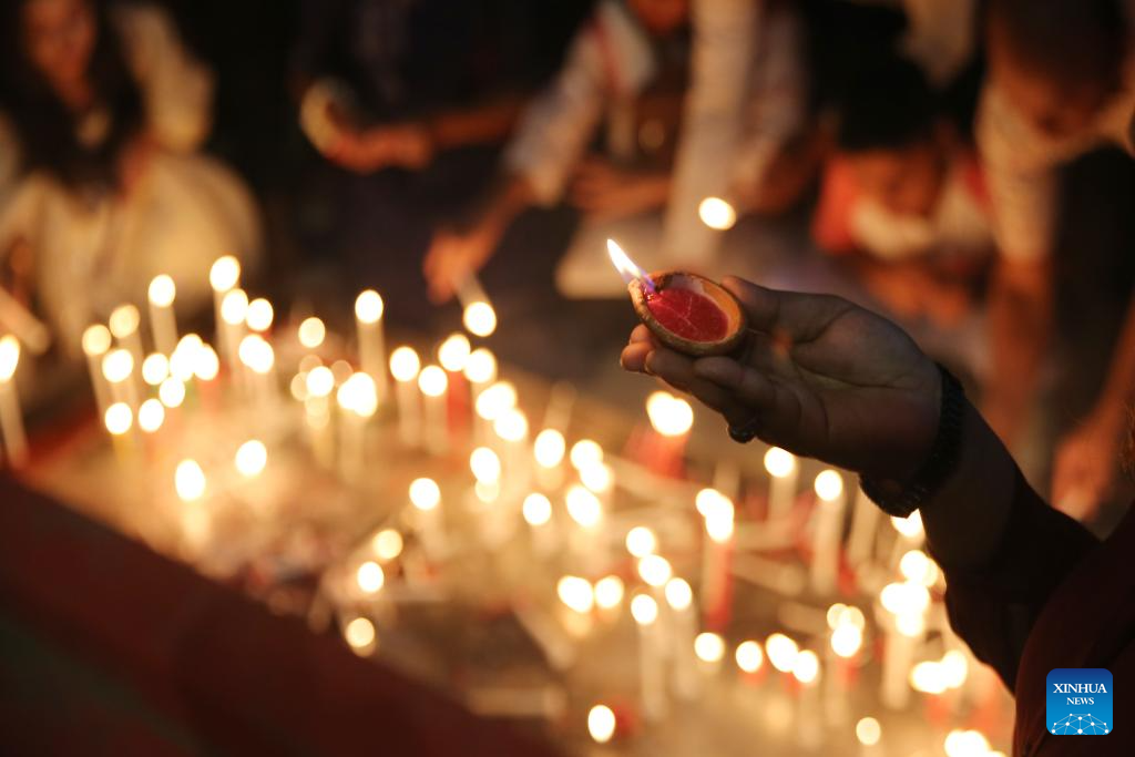 DHAKA, 21 octubre, 2025 (Xinhua) -- Imagen del 20 de octubre de 2025 de personas encendiendo velas para celebrar el Diwali, o el festival hindú de las luces, en un templo, en Dhaka, Bangladesh. (Xinhua/Habibur Rahman)