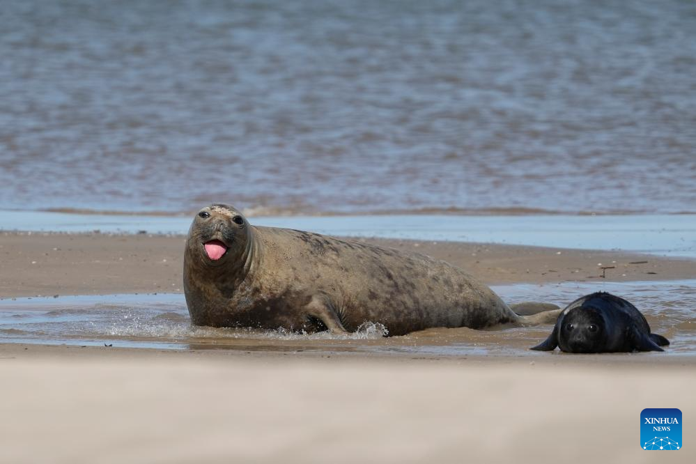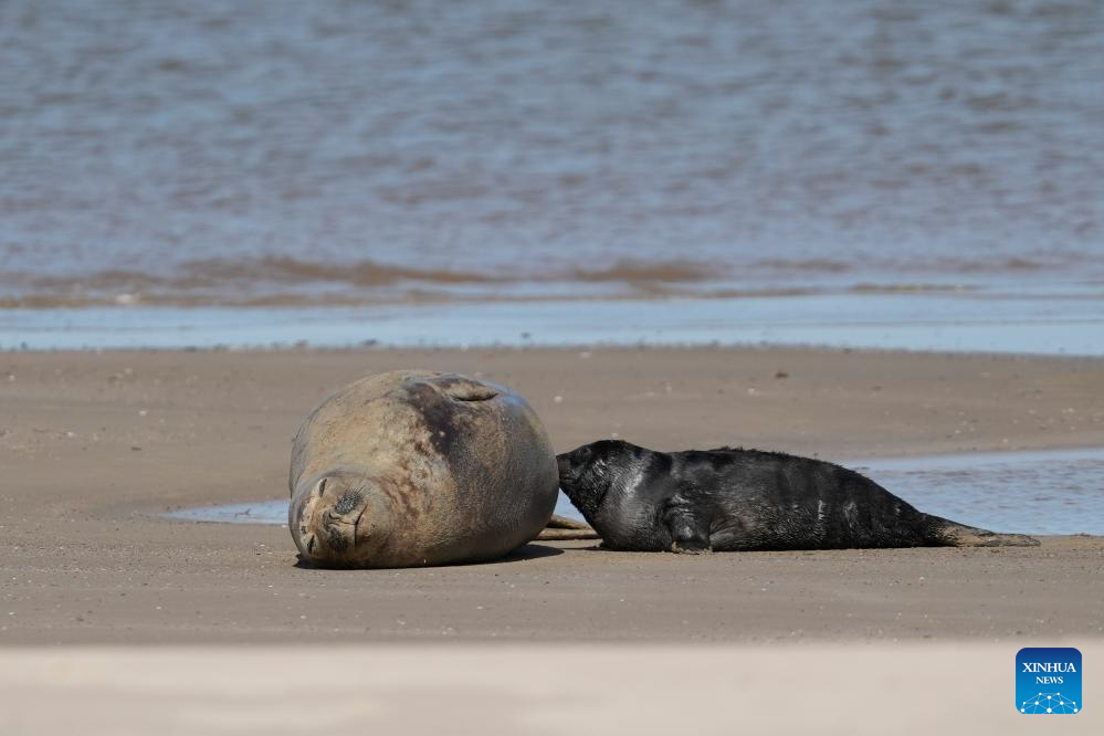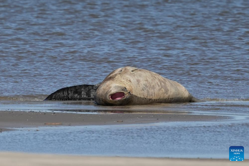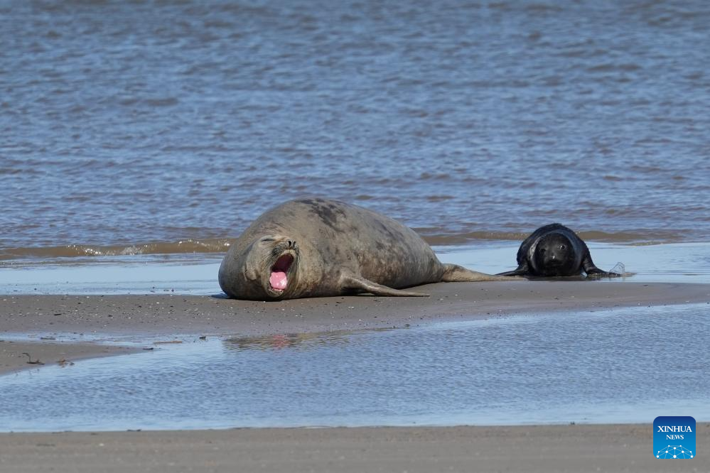 PIRIAPOLIS, 21 octubre, 2025 (Xinhua) -- Una elefanta marina descansa junto a su cría en una playa, en Piriápolis, en el departamento de Maldonado, Uruguay, el 21 de octubre de 2025. (Xinhua/Nicolás Celaya)