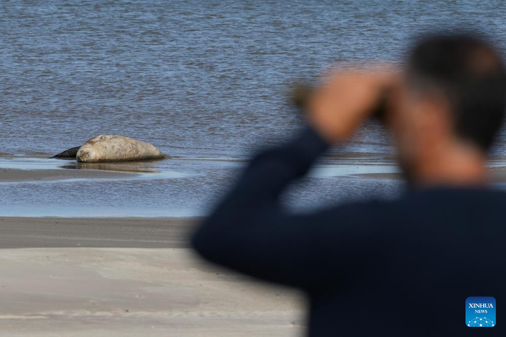 PIRIAPOLIS, 21 octubre, 2025 (Xinhua) -- Una niña y su padre observan a una elefanta marina mientras descansa junto a su cría en una playa, en Piriápolis, en el departamento de Maldonado, Uruguay, el 21 de octubre de 2025. (Xinhua/Nicolás Celaya)