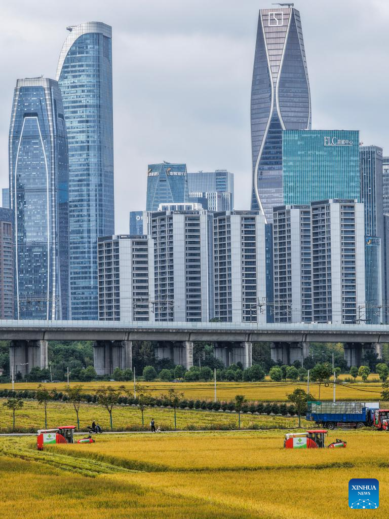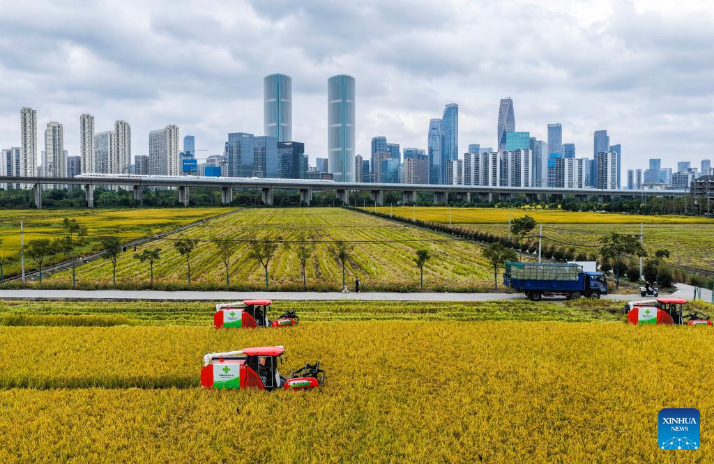 ANGZHOU, 21 octubre, 2025 (Xinhua) -- Imagen tomada con un dron el 21 de octubre de 2025 de cosechadoras recolectando arroz en un arrozal, con un tren de alta velocidad al fondo, en Hangzhou, en la provincia de Zhejiang, en el este de China. (Xinhua/Xu Yu)