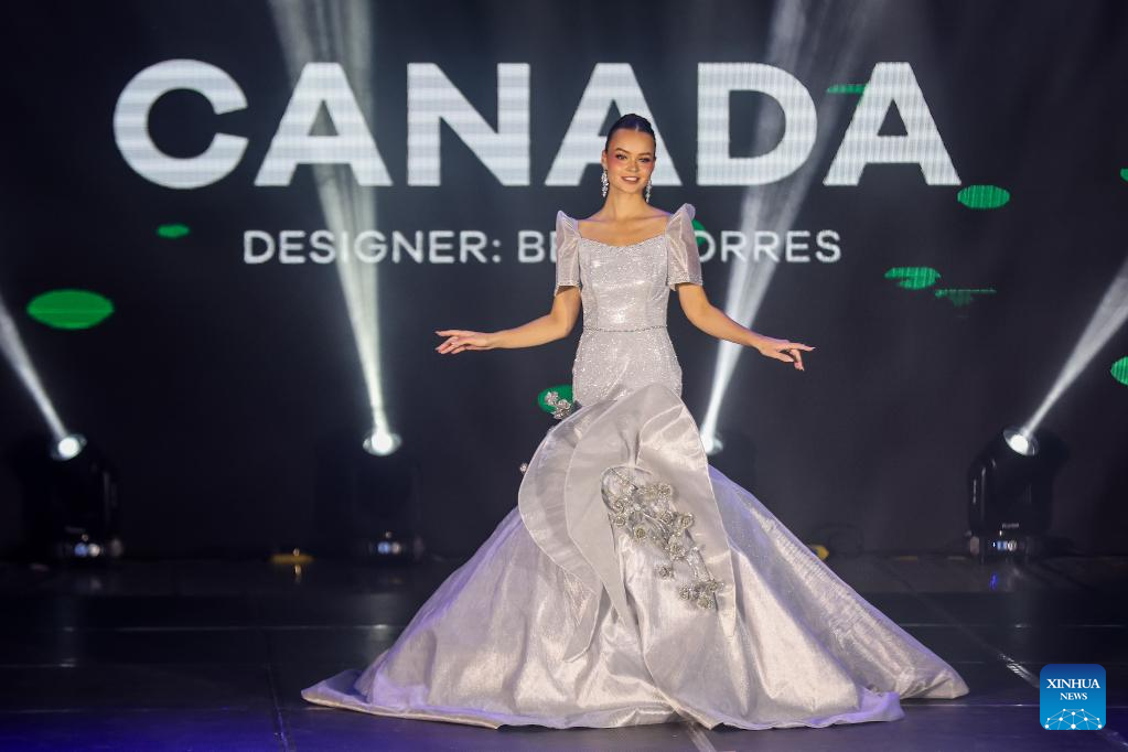 CIUDAD QUEZON, 22 octubre, 2025 (Xinhua) -- Hailey Wilson, de Canadá, presenta una creación durante el Desfile de Modas del Terno Filipino de Miss Tierra 2025, en Ciudad Quezón, Filipinas, el 22 de octubre de 2025. Las candidatas a Miss Tierra 2025 de varios países participaron en el desfile de modas con vestidos confeccionados por diseñadores filipinos en celebración del 25 aniversario del certamen de belleza. (Xinhua/Rouelle Umali)