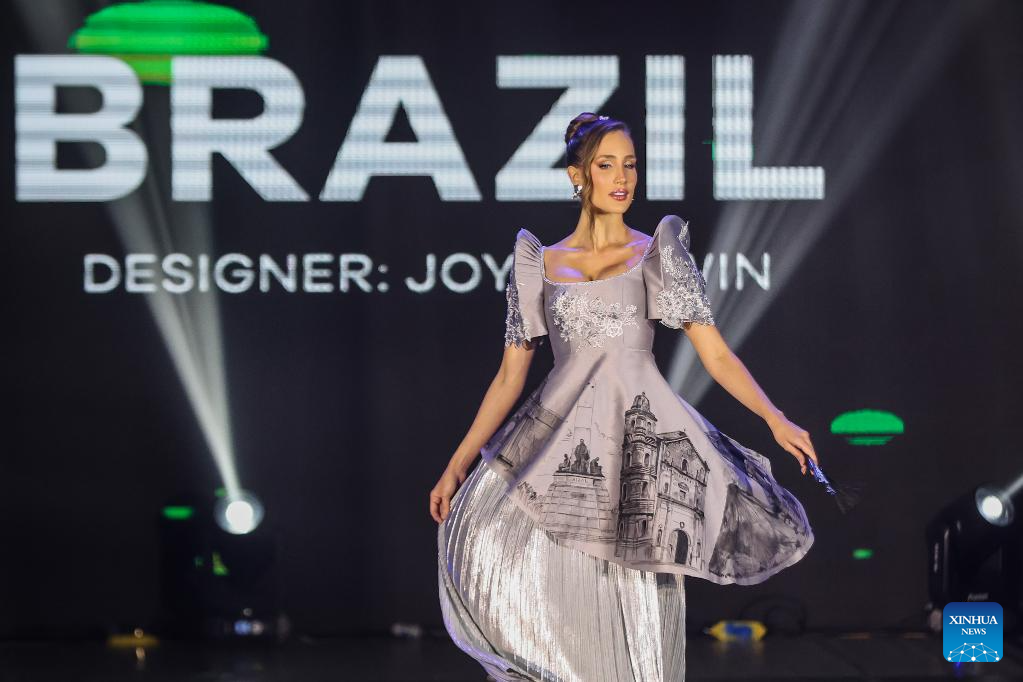 CIUDAD QUEZON, 22 octubre, 2025 (Xinhua) -- Laila Frizon, de Brasil, presenta una creación durante el Desfile de Modas del Terno Filipino de Miss Tierra 2025, en Ciudad Quezón, Filipinas, el 22 de octubre de 2025. Las candidatas a Miss Tierra 2025 de varios países participaron en el desfile de modas con vestidos confeccionados por diseñadores filipinos en celebración del 25 aniversario del certamen de belleza. (Xinhua/Rouelle Umali)
