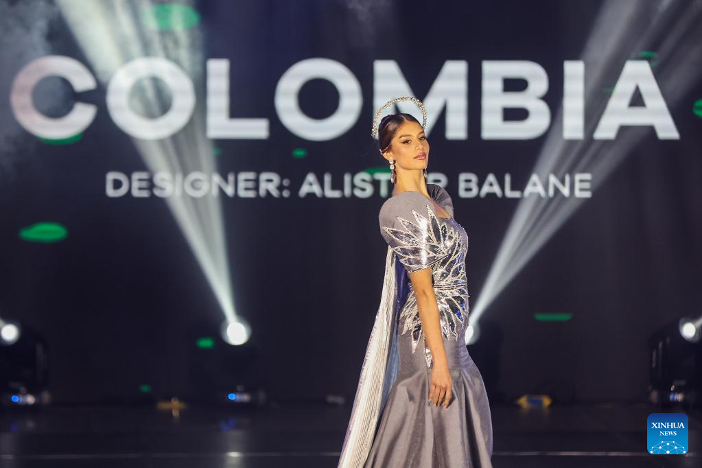 CIUDAD QUEZON, 22 octubre, 2025 (Xinhua) -- Valentina Collazos, de Colombia, presenta una creación durante el Desfile de Modas del Terno Filipino de Miss Tierra 2025, en Ciudad Quezón, Filipinas, el 22 de octubre de 2025. Las candidatas a Miss Tierra 2025 de varios países participaron en el desfile de modas con vestidos confeccionados por diseñadores filipinos en celebración del 25 aniversario del certamen de belleza. (Xinhua/Rouelle Umali)