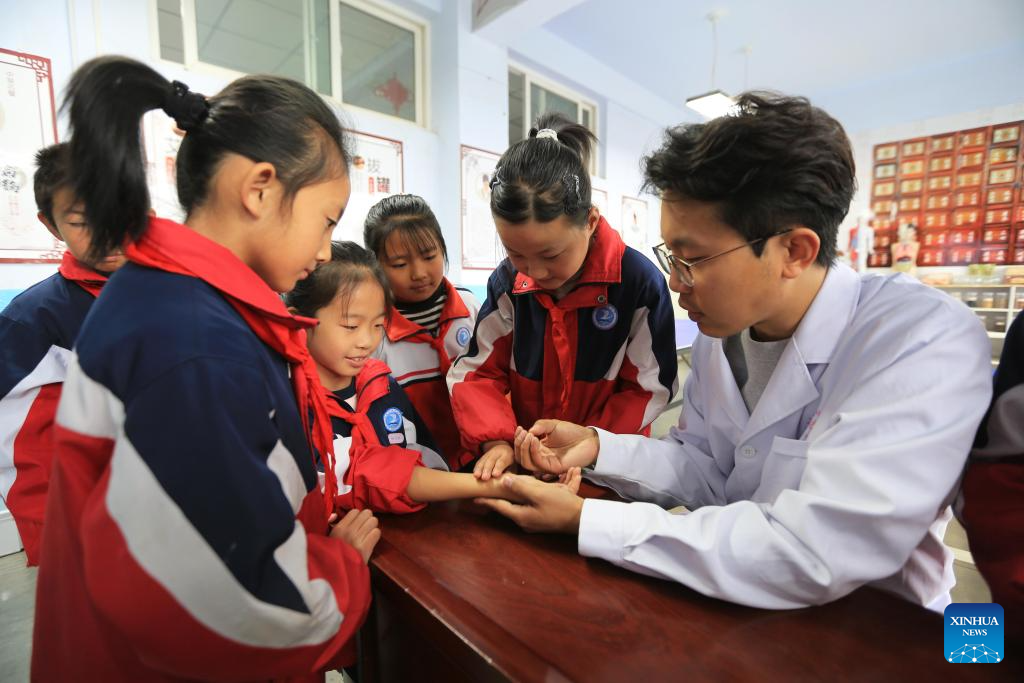 BEIJING, 22 octubre, 2025 (Xinhua) -- Un médico guía a los estudiantes para que experimenten el diagnóstico del pulso en una escuela primaria, en el distrito de Anding de la ciudad de Dingxi, en la provincia de Gansu, en el noroeste de China, el 22 de octubre de 2025. Clases sobre la medicina tradicional china fueron impartidas de diversas formas en todo el país para celebrar el Día Mundial de la Medicina Tradicional que se celebra anualmente el 22 de octubre. (Xinhua/Wang Kexian)