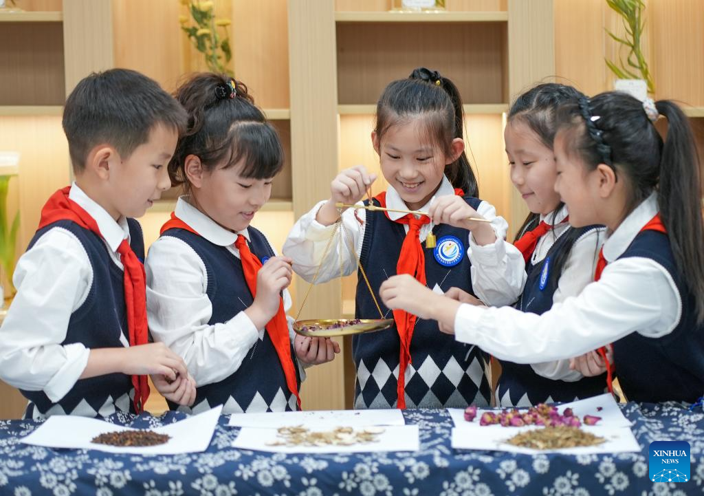 BEIJING, 22 octubre, 2025 (Xinhua) -- Estudiantes miden hierbas de la medicina tradicional china (MTC) en una escuela primaria, en la ciudad de Taizhou, en la provincia de Jiangsu, en el este de China, el 22 de octubre de 2025. Clases sobre la MTC fueron impartidas de diversas formas en todo el país para celebrar el Día Mundial de la Medicina Tradicional que se celebra anualmente el 22 de octubre. (Xinhua/Zhou Shegen)