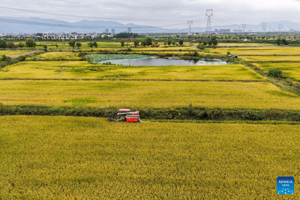JINHUA, 22 octubre, 2025 (Xinhua) -- Vista aérea tomada con un dron el 22 de octubre de 2025 de una segadora cosechando arroz con cáscara en una zona de demostración de tierras agrícolas de alta calidad, en el poblado de Tangya del distrito de Jindong, en la ciudad de Jinhua, en la provincia de Zhejiang, en el este de China. (Xinhua/Xu Yu)