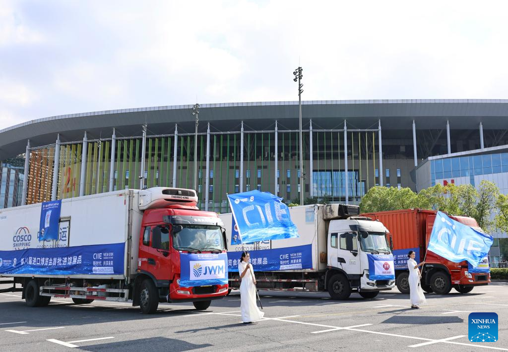 SHANGHAI, 23 octubre, 2025 (Xinhua) -- Una ceremonia que marca la llegada de las piezas de exhibición para la próxima 8ª Exposición Internacional de Importaciones de China (CIIE, por sus siglas en inglés) se lleva a cabo en la plaza norte del Centro Nacional de Exposiciones y Convenciones (Shanghai), la sede principal de la CIIE, en Shanghai, en el este de China, el 23 de octubre de 2025. El primer lote de piezas de exhibición para las áreas de exposición de Industria Inteligente y Tecnología de la Información, Productos Alimenticios y Agrícolas, y Equipos Médicos y Productos para el Cuidado de la Salud de la 8ª CIIE llegó el jueves al Centro Nacional de Exposiciones y Convenciones (Shanghai). (Xinhua/Fang Zhe)
