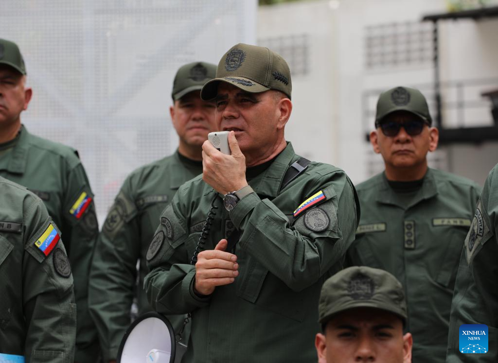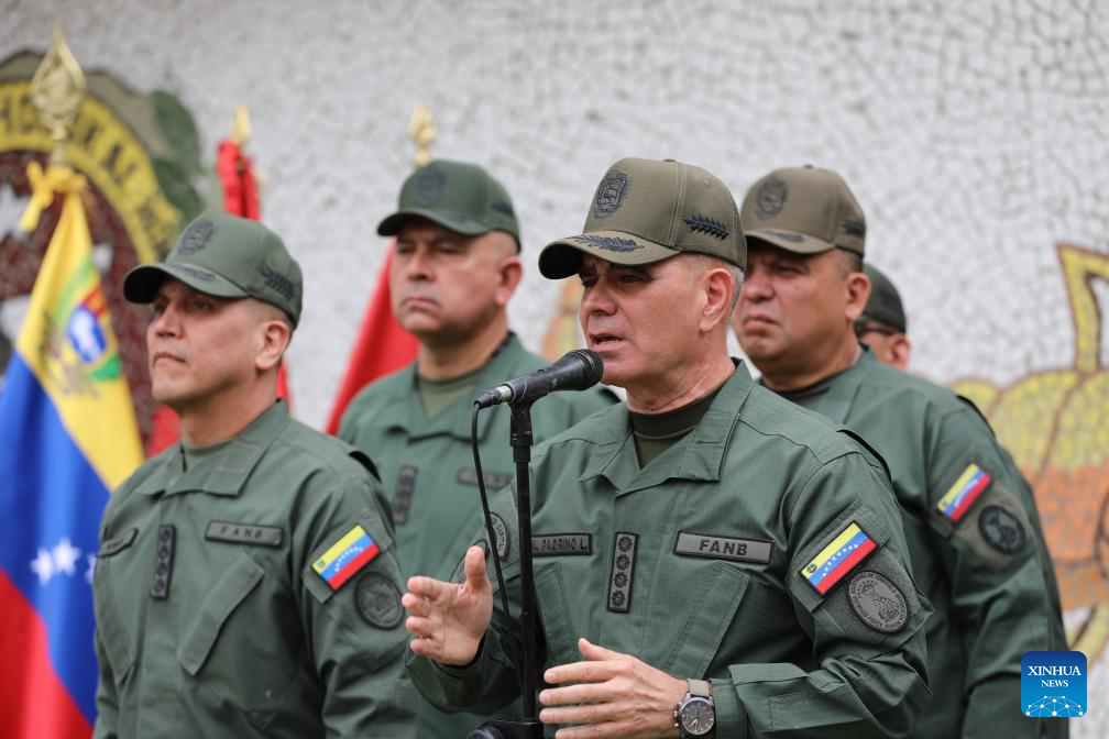CARACAS, 23 octubre, 2025 (Xinhua) -- Imagen proveída por el Ministerio para la Defensa de Venezuela del ministro del Poder Popular para la Defensa de Venezuela, Vladimir Padrino López (c), hablando ante integrantes de la Guardia Nacional Bolivariana durante la realización de los ejercicios de defensa de Costa Independencia 200, en Caracas, Venezuela, el 23 de octubre de 2025. Padrino López informó el jueves que las operaciones militares en curso tienen como objetivo salvaguardar el territorio nacional ante posibles amenazas extranjeras. (Xinhua/Ministerio para la Defensa de Venezuela)