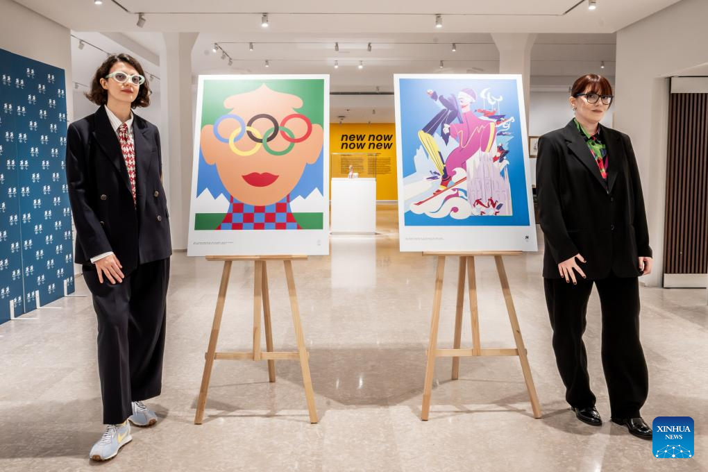 MILAN, 23 octubre, 2025 (Xinhua) -- Imagen del 22 de octubre de 2025 de las artistas italianas, Olimpia Zagnoli (i), y Carolina Altavilla, posando con los carteles durante la ceremonia de develación de los Carteles Icónicos Oficiales de los Juegos Olímpicos y Paralímpicos de Invierno de Milán Cortina 2026, en la Trienal de Milán, en Milán, Italia. (Xinhua)
