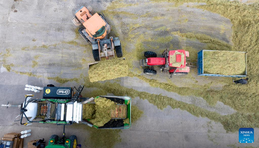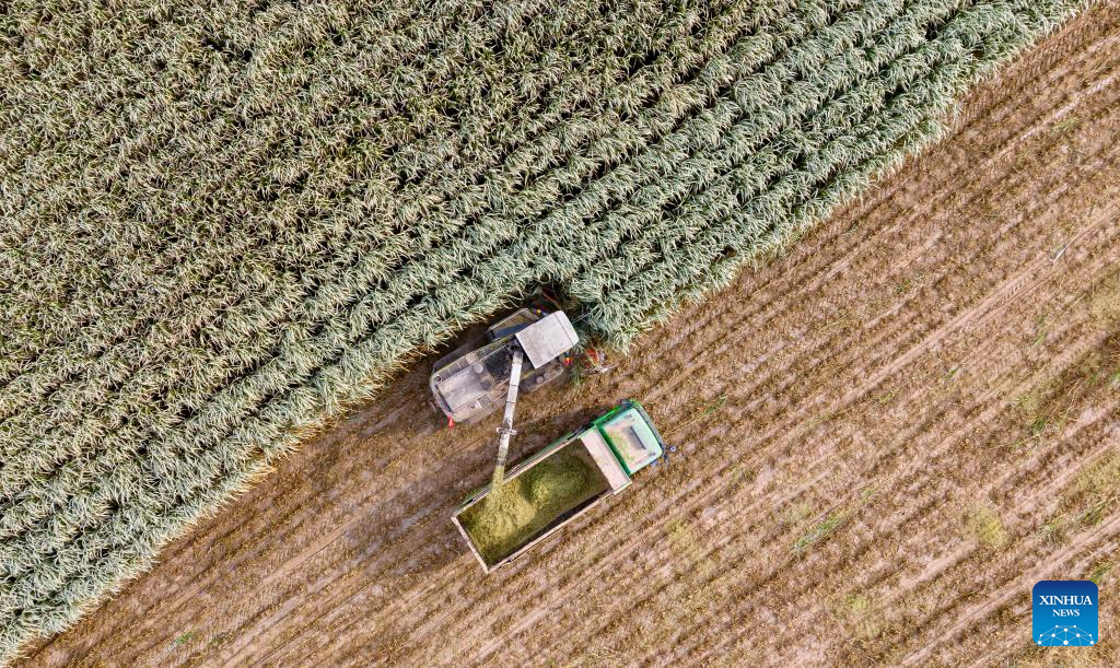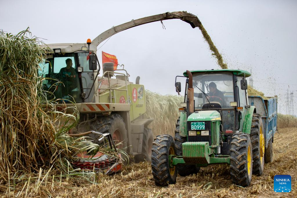 YINCHUAN, 24 octubre, 2025 (Xinhua) -- Imagen del 23 de octubre de 2025 de agricultores operando máquinas agrícolas para cosechar juncao gigante, en el poblado de Minning del distrito de Yongning, en Yinchuan, en la región autónoma hui de Ningxia, en el noroeste de China. El juncao gigante cosechado se utilizará como ensilaje para apoyar el desarrollo de la industria de cría de ganado vacuno y ovino. (Xinhua/Yang Zhisen)