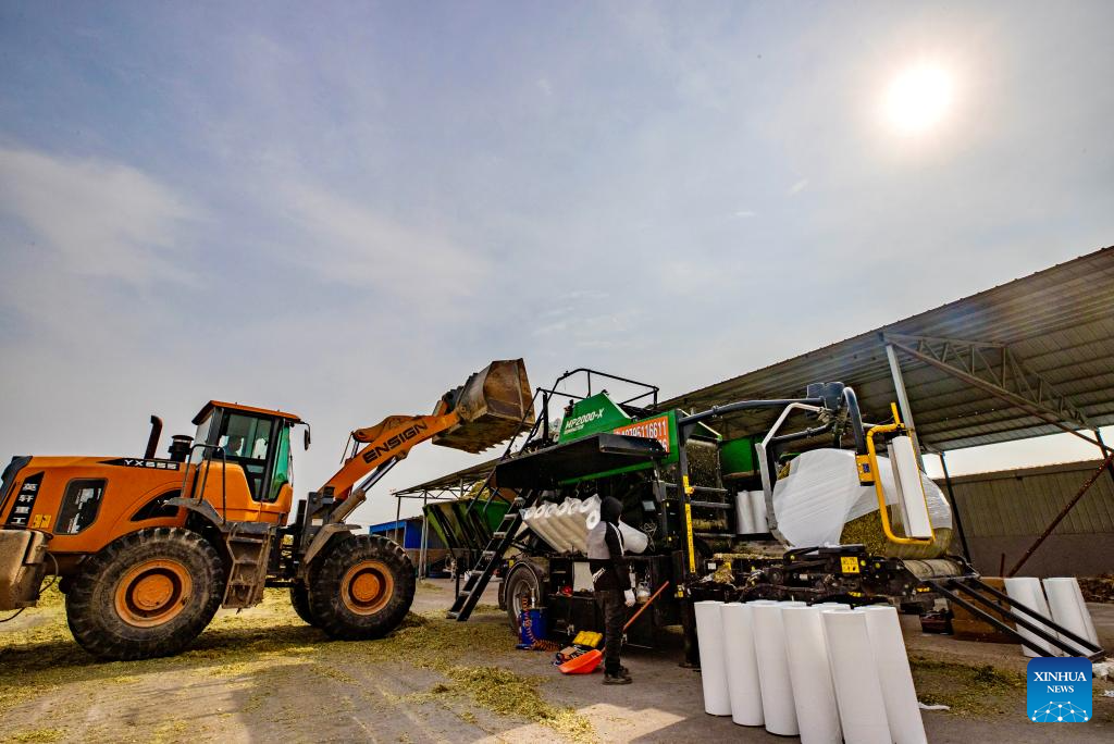 YINCHUAN, 24 octubre, 2025 (Xinhua) -- Imagen del 23 de octubre de 2025 de agricultores empacando juncao gigante cosechado, en el poblado de Minning del distrito de Yongning, en Yinchuan, en la región autónoma hui de Ningxia, en el noroeste de China. El juncao gigante cosechado se utilizará como ensilaje para apoyar el desarrollo de la industria de cría de ganado vacuno y ovino. (Xinhua/Yang Zhisen)