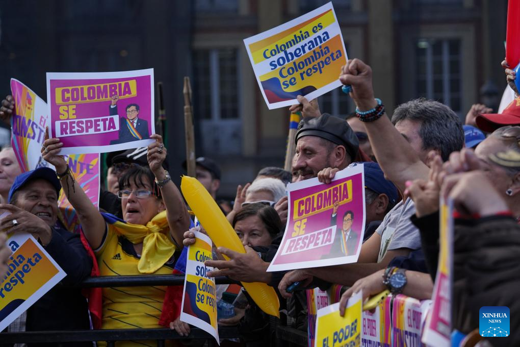 Personas sostienen pancartas en apoyo al presidente colombiano, Gustavo Petro, durante una concentración en la Plaza de Bolívar, en Bogotá, capital de Colombia, el 24 de octubre de 2025. Petro anunció el viernes que prepara su defensa legal ante la confirmación del Gobierno de Estados Unidos sobre sanciones contra él y su familia por presuntos vínculos con el narcotráfico. (Xinhua/Andrés Moreno)