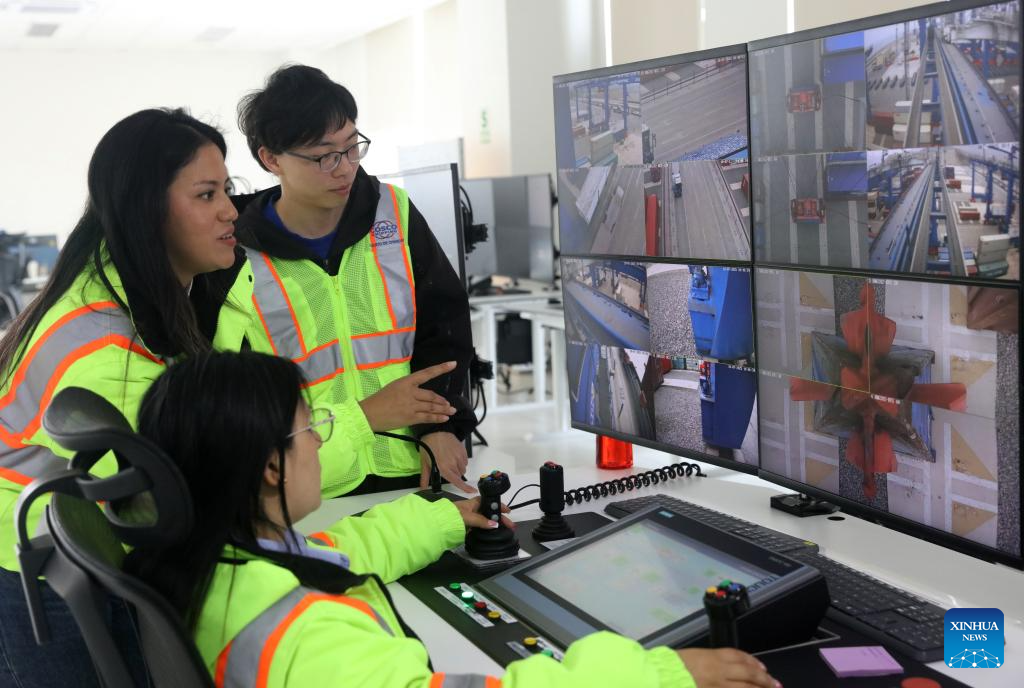 CHANCAY, 25 octubre, 2025 (Xinhua) -- Imagen del 7 de octubre de 2025 de Astrid Lozano (c), bilingüe chino-español y analista de estadísticas y reportes, trabajando en las oficinas del puerto de Chancay, en Chancay, Perú. (Xinhua/Mariana Bazo)