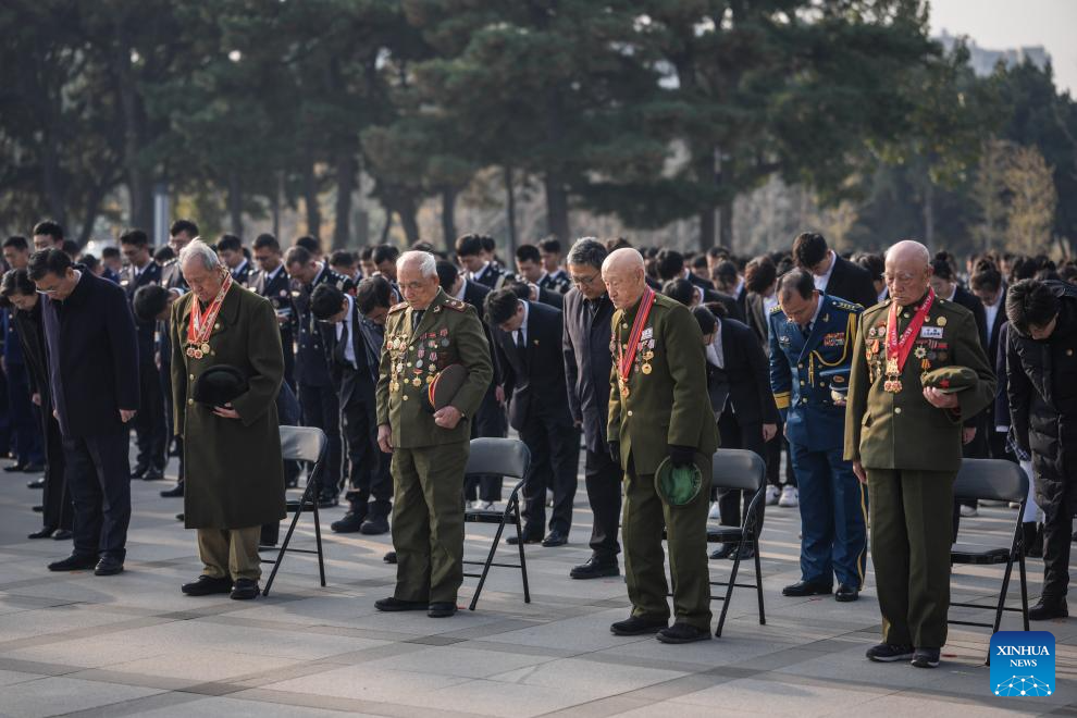 SHENYANG, 25 octubre, 2025 (Xinhua) -- Veteranos de los Voluntarios del Pueblo Chino (VPCh) guardan un momento de silencio durante una ceremonia de presentación de cestas de flores en el cementerio de los mártires de los VPCh, en Shenyang, en la provincia de Liaoning, en el noreste de China, el 25 de octubre de 2025. La provincia de Liaoning realizó el sábado ceremonias de presentación de cestas de flores en Shenyang y Dandong para conmemorar el 75º aniversario del ingreso a la República Popular Democrática de Corea de los VPCh para luchar en la Guerra de Resistencia contra la Agresión de Estados Unidos y de Ayuda a Corea. (Xinhua/Pan Yulong)